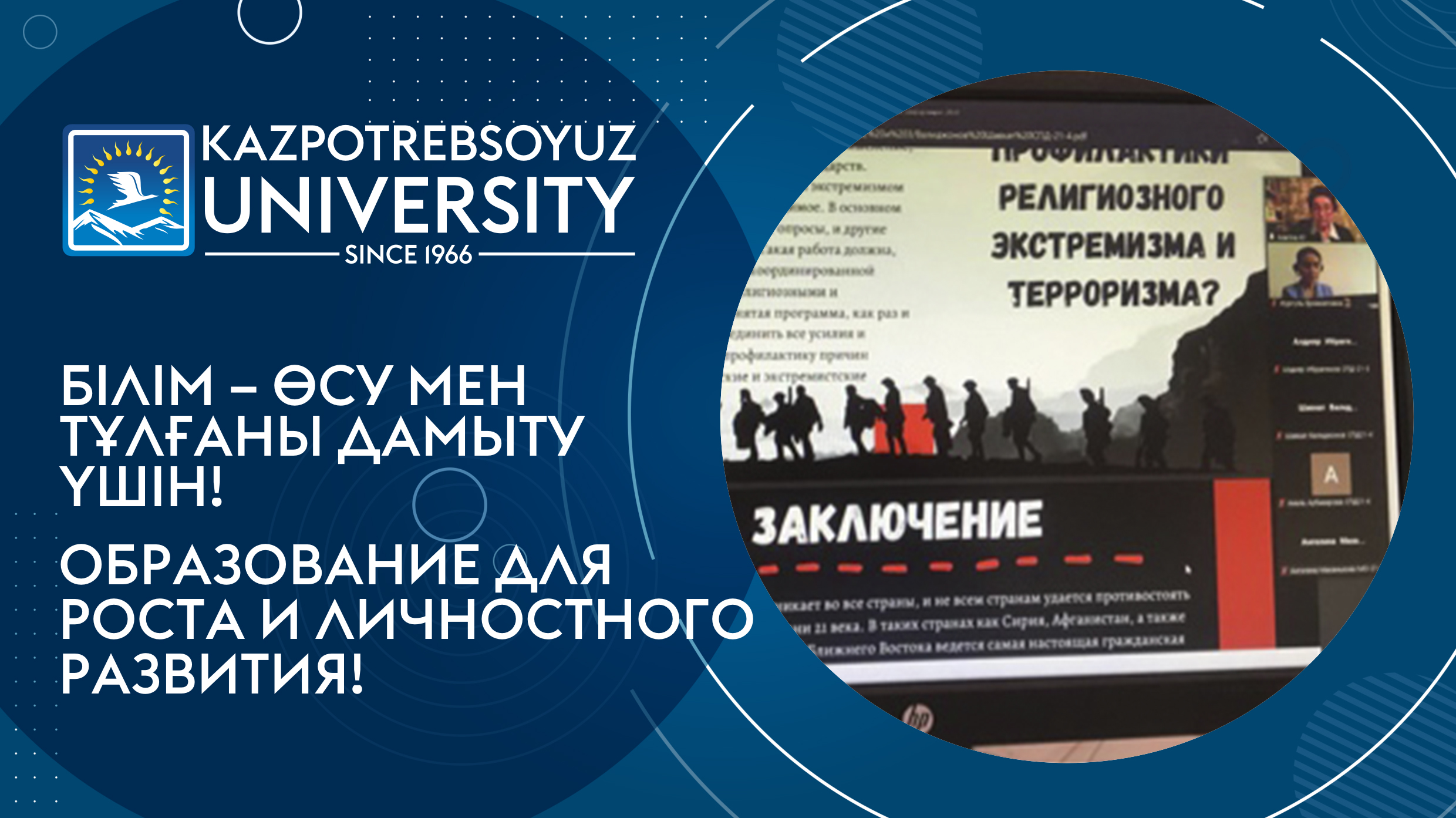 5 октября 2021 года в Карагандинском университете Казпотребсоюза прошел онлайн круглый стол на тему: «Философия образования: модернизация и цифровизация образования» в рамках реализации Программы «Рухани жаңғыру», организованная кафедрой СПД и АНК, в которой активное участие приняли студенты 2 курса. Были обсуждены доклады, имеющие значимость и в рамках исследовательской деятельности студентов, развития их творческого потенциала, и в рамках формирования мировоззрения, культуры мышления и модернизации общественного сознания студенческой молодежи.