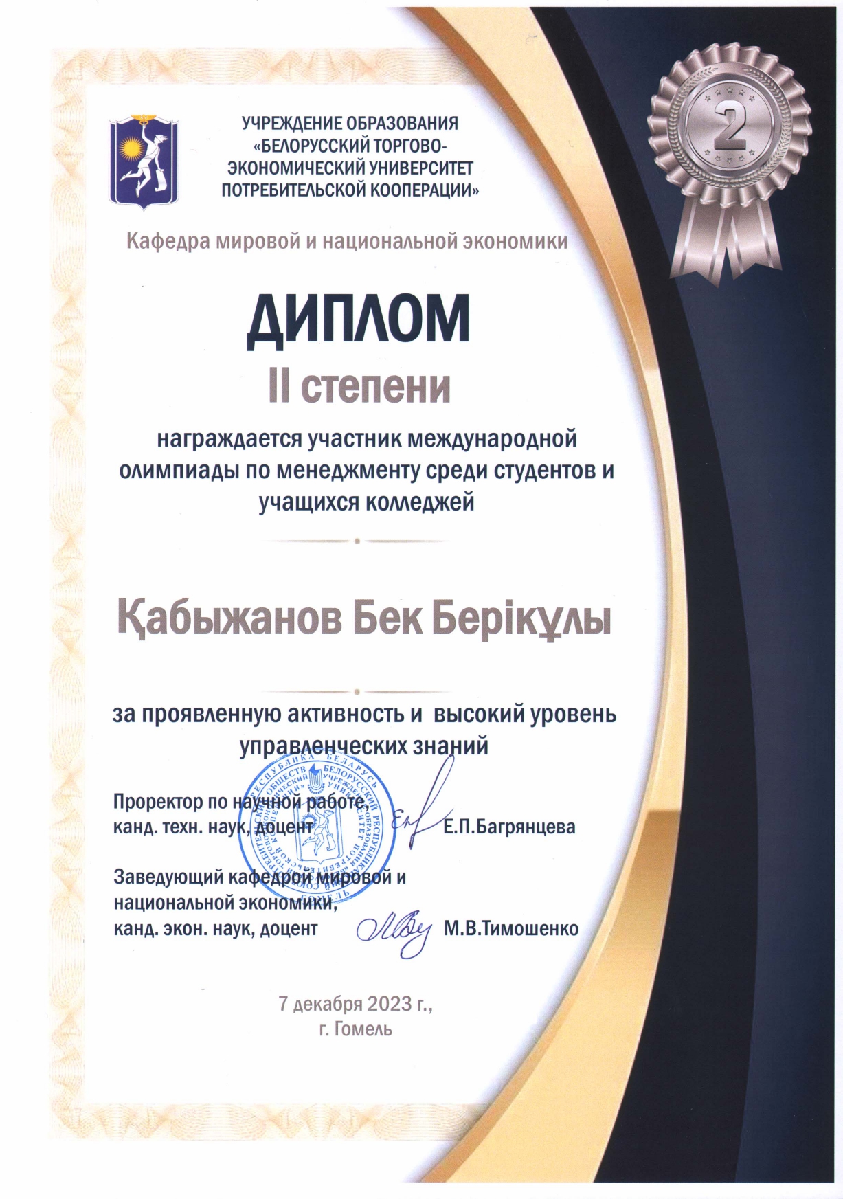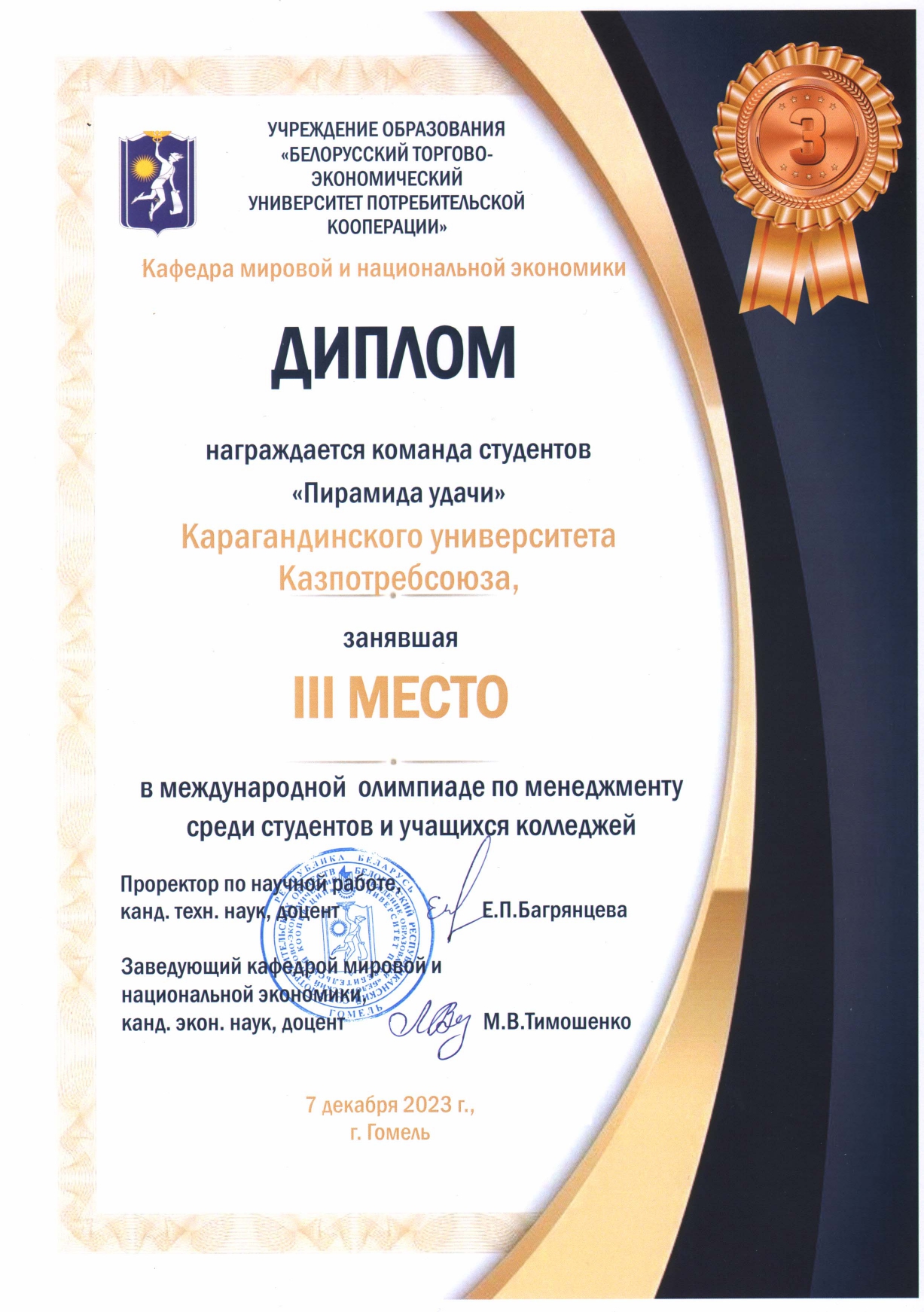7 декабря 2023 года студенты нашего университета приняли участие в международной олимпиаде по менеджменту среди студентов и учащихся колледжей, которая была проведена в УО "Белорусском торгово-экономическом университете потребительской кооперации" (г. Гомель). В олимпиаде приняли участие команды студентов от университетов-партнеров Казахстана, России и Беларуси.