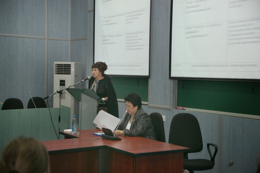 С приветственным словом к участникам конференции обратилась декан Учетно-финансового факультета д.э.н., профессор Накипова Г.Е., которая пожелала всем интересной и плодотворной работы. На ее взгляд, конференция будет способствовать приобщению студентов и магистрантов к науке и научным исследованиям в области бухгалтерского учета и аудита, так как нынешняя ситуация в мировой экономике требует расширения исследований именно в области бухгалтерского учета. Затем выступила заведующая кафедрой бухгалтерского учета и аудита к.э.н., профессор КЭУ Мадиева К.С. Она отметила, что с распадом Советского союза и выделением Казахстана как суверенного государства в его экономической политике произошли значительные изменения. Переход от командно-административной системы управления к рыночным отношениям не мог не сказаться и на системе бухгалтерского учета. Бухгалтерский учет в Республике Казахстан подвергся коренному реформированию. Исходя из этого задача настоящей конференции проанализировать этапы реформирования бухгалтерского учета и аудита в РК, обсудить проблемы, возникшие перед бухгалтерским учетом и наметить пути их решения. В работе конференции приняли участие: 1. Скорикова Вера Ивановна финансовый директор ТОО «ИнтерКомпьютерСервис» 2. Стратонова Анна Павловна, главный бухгалтер ТОО “Victory-trans” 3. Карасева Алена Константиновна, главный бухгалтер ТОО «Бизнес Инжиниринг» 4. Денисова Анна Борисовна, главный бухгалтер ТОО «Оптимум Контракт» 5. Постникова Л.В., к.э.н., доцент заведующая кафедрой бухгалтерского учета РГАУ-МСХА им. К.А.Тимирязева, г.Москва, Россия 6. Верига Ю.А., к.э.н., профессор, заведующая кафедрой бухгалтерского учета и аудита ВУЗ УКООПСОЮЗА «Полтавский университет экономики и торговли», Украина 7. Карпенко Е.А.старший преподаватель кафедры бухгалтерского учёта и аудита ВУЗ Укоопсоюза «Полтавский университет экономики и торговли», г. Полтава, Украина 8. Склярук И.П.,аспирантка Киевского национального университета имени Тараса Шевченко, Украина 9. Кулык В.А. к.э.н., доцент кафедры бухгалтерского учета и аудита Полтавского университета экономики и торговли, г.Полтава, Украина 10. Хомедюк В. А., Боровик А. Н., ст. преподаватели кафедры учета и аудита Национальный университет водного хозяйства и природопользования, г. Ривне, Украина 11. Борлакова Т. М., Темиров Э.В., Чомаева Р.А., Текеева Х. Э., Лайпанова З.М., Узденова Ф.М. к.э.н., доценты кафедры бухгалтерского учета и аудита Северо-Кавказская государственная гуманитарно-технологическая академия г.Черкесск, Россия 12. Ажибаева З.Н., к.э.н., проф., заведующая кафедрой бухгалтерского учета и аудита университета международного бизнеса, г. Алматы 13. Тажибаев С.Д. Зав. кафедрой финансы Таразского государственного университета им. М.Х. Дулати, г. Тараз Тажибаева А.С. к.э.н., доцент кафедры учет и аудит Таразского государственного университета им. М.Х. Дулати, г. Тараз 14. Мукимбекова Н.А., к.э.н., заведующая кафедрой бухгалтерского учета и аудита Костанайского Государственного Университета им. А.Байтурсынова и группа преподавателей этой кафедры 15. Жакупов Г. С, к.э.н., профессор КарГУ им. Е.А.Букетова и группа студентов КарГУ 16. Нургалиева А.К., ассистент кафедры «Учет и Аудит», Карагандинского государственного индустриального университета, г. Темиртау 17. Ильина Т.Ф. ст. преп. кафедры Учета и ауд