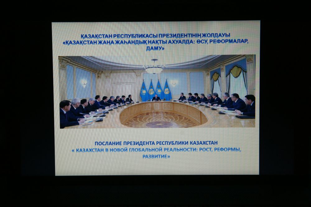 Выступившие на собрании директор НИИ НЭСА, д.э.н., профессор Айнабек К.С., проректор по социальным вопросам, д.и.н., профессор Абилов К.Ж., заведующая кафедрой Экономики и Менеджмента, доктор Phd Мусатаева А.А., разъяснили основные положения Послания и выразили поддержку курсу Главы государства.
