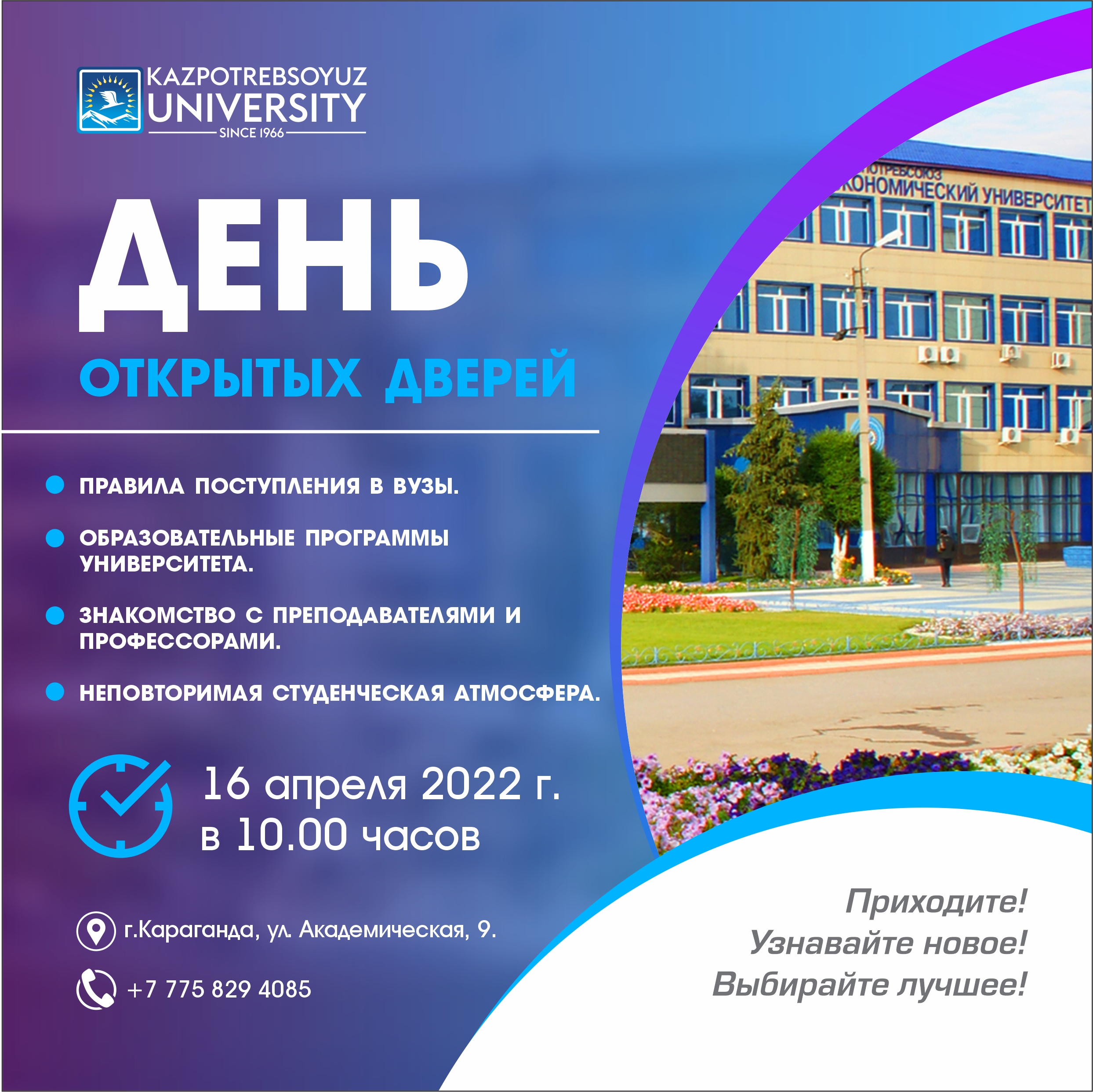 Ждем вас 16.04.2022 г. в 10.00 часов по адресу: г.Караганда, ул. Академическая, 9. Телефон +7 775 829 4085.