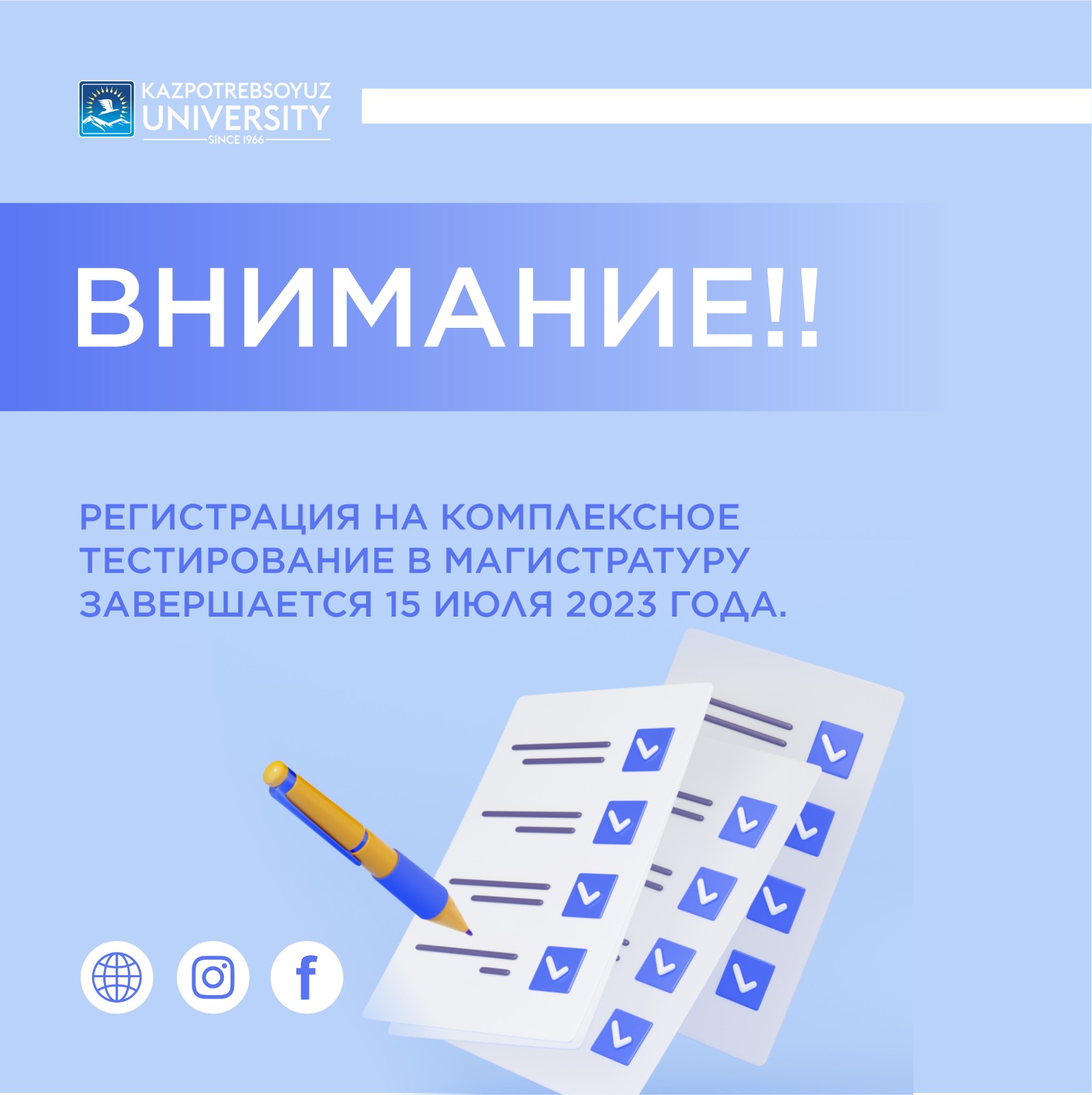 Прием заявлений на комплексное тестирование для поступления в магистратуру будет проводиться с 1 июня до 15 июля на сайте www.app.testcenter.kz. Тестирование начнется 20 июля и продлится до 10 августа. Время, дату и адрес по которому будет проходить КТ – вы можете узнать 18 июля в своем личном кабинете. Стоимость участия в КТ составляет 14 693 тенге.