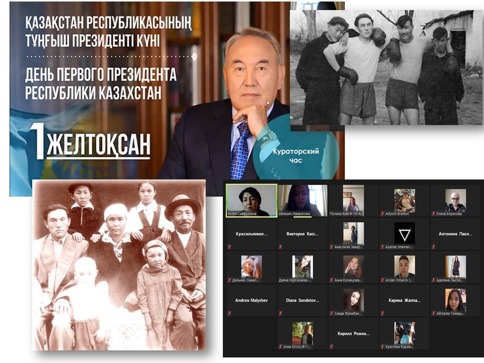 30 ноября 2020 г. кураторами Сайфуллиной Ю.М., Идирисовой А.Т., Борисовой Е.И. на платформе ZOOM был проведен в группах Ф-19-4с, Ф-18-2, Ф-19-2 открытый кураторский час на тему «Елбасы – Лидер нации!», посвященный Дню Первого Президента. На кураторском часе был обсужден доклад «Первый Президент – человек эпохи», просмотрен биографический видеоролик, а также среди групп была проведена викторина.