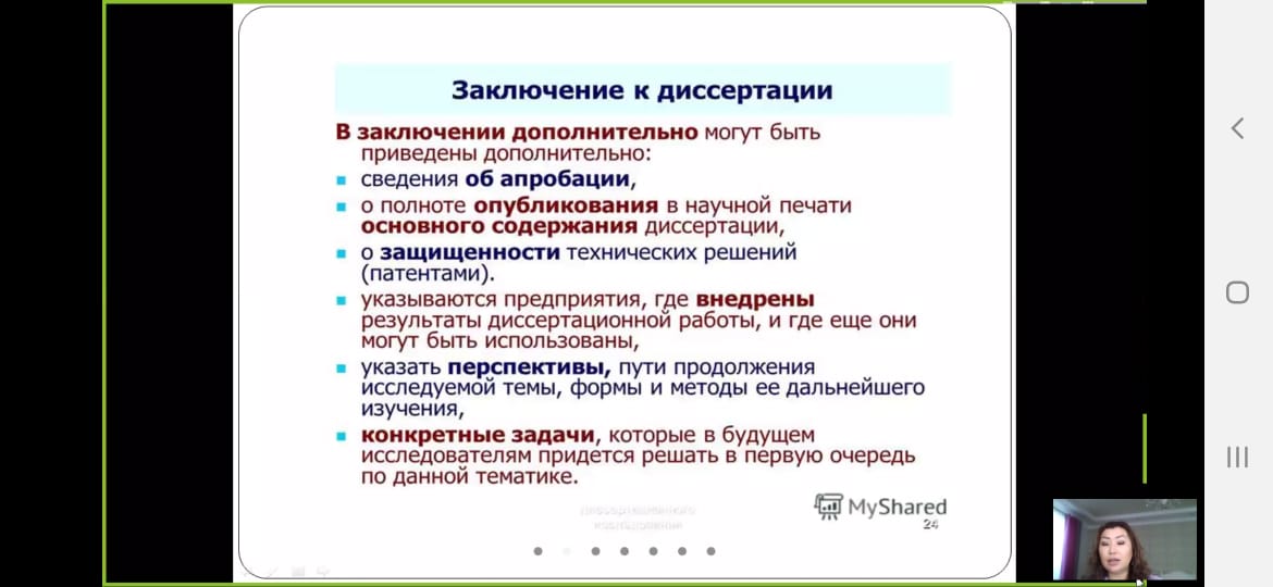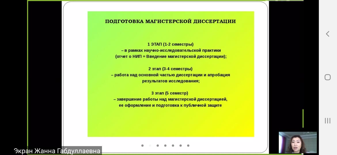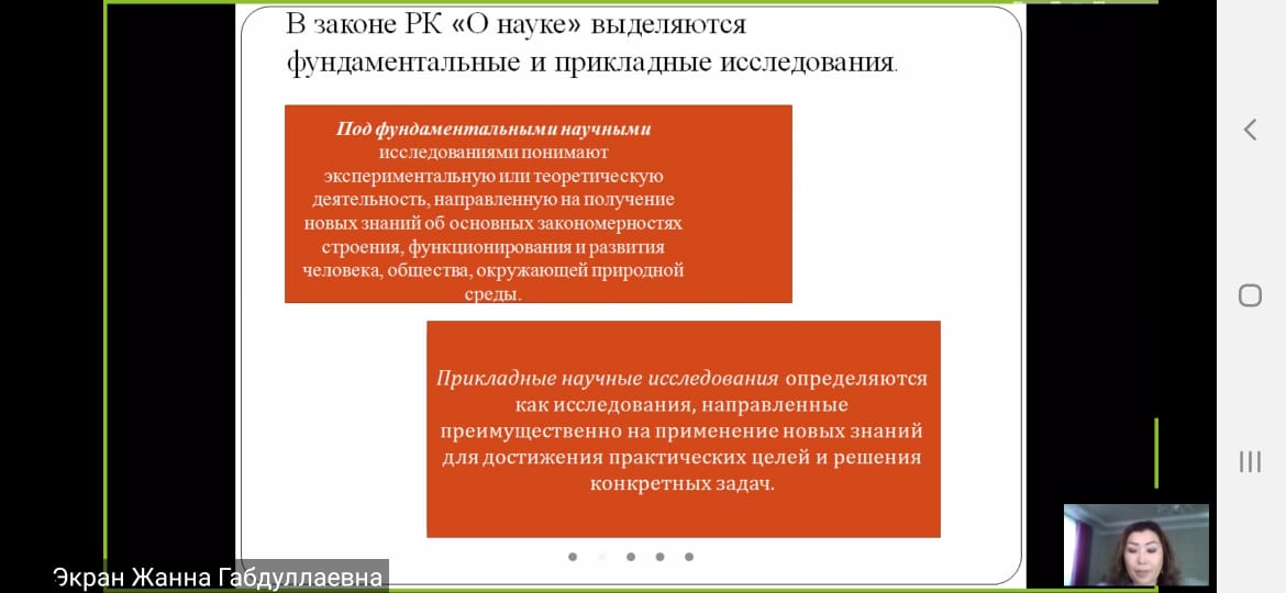 На семинаре обсуждались актуальные вопросы исследования, структура диссертационных работ. Спикером Шугаиповой Ж. Г. в полной мере была разъеснена подготовка к проведению научного исследования, необходимость достижения поставленных целей и задач. Участниками были заданы вопросы об исследованиях, проводимых в Казахстане, что является мотивацией для молодых ученных в наше время. Спикер дала подробные ответы на поставленные вопросы.