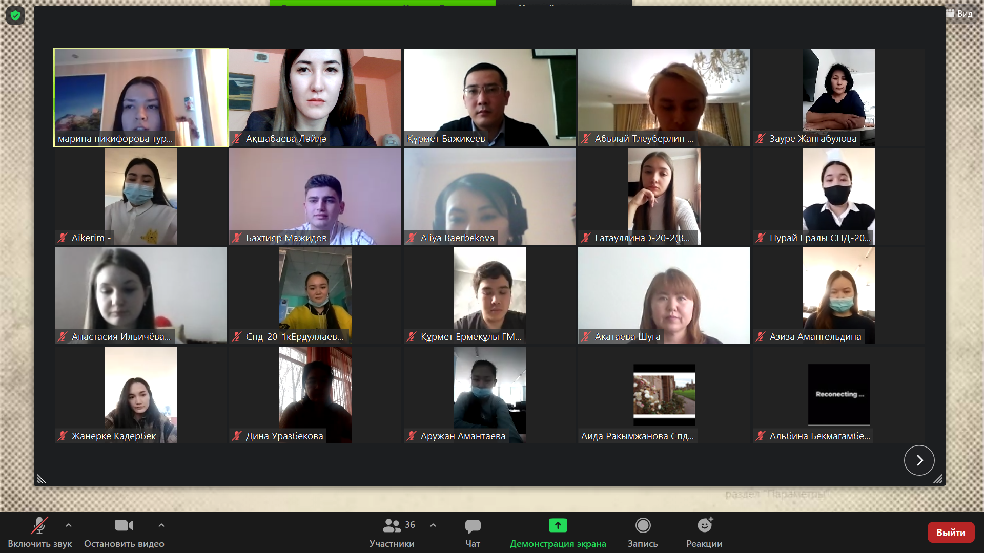 15.02.21 года на платформе Zoom Кафедрой Казахского языка и Культуры Казахстана в рамках программы «Рухани жаңғыру» был проведен круглый стол «Духовное наследие Абая Кунанбаева», посвященный жизни и творчеству великого казахского поэта Абая Кунанбаева. Цель: познакомить с образцовой жизнью великого поэта, пропагандировать мудрость, духовное наследие поэта, научить выразительно читать и петь его стихи, песни. Помощь в художественной речи, самостоятельном поиске, творческой работе. В круглом столе приняли участие преподаватели и студенты кафедры.