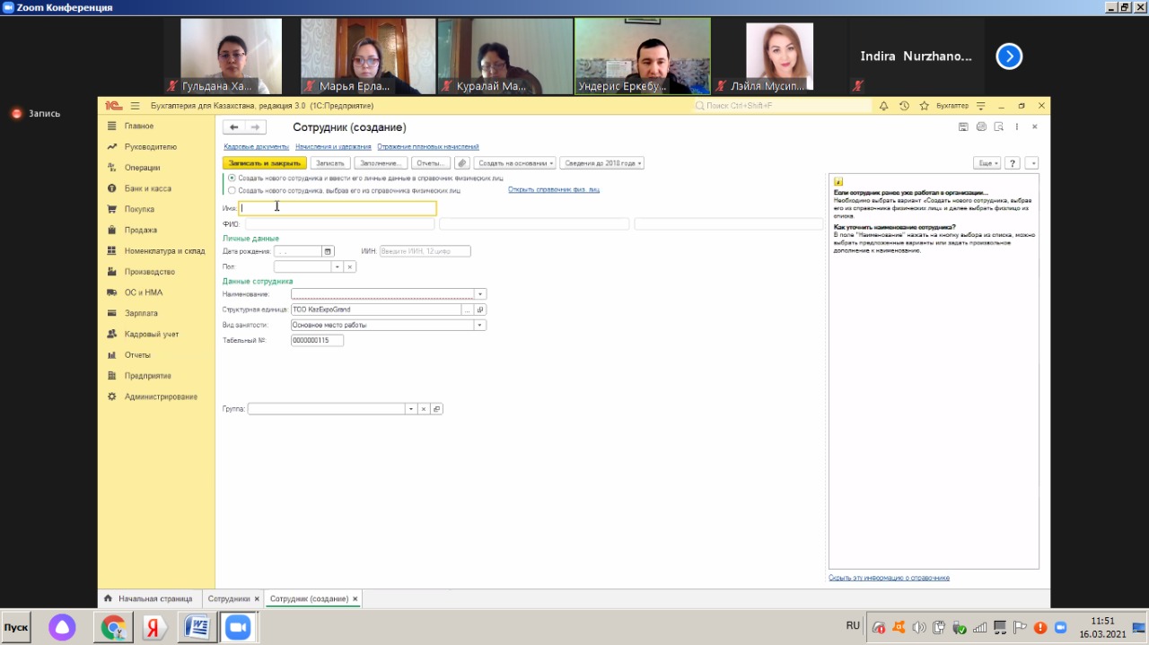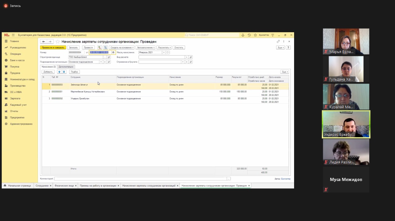 16 марта 2021 года состоялся онлайн-вебинар с участием директора ТОО «ТабысАудитКонсалтинг» Ундерис Еркебуланом на тему «Учёт заработной платы в 1С:Бухгалтерии». В ходе вебинара был рассмотрен вопрос о всех вычетах по заработной плате, изменения и нововведения по корректировке заработной платы. Ундерис Еркебулан детально продемонстрировал в программе, весь учёт по заработной плате. Модератором данного онлайн-вебинара выступила преподаватель кафедры «Бухгалтерский учёт и аудит» Хасенова М.Е. Профессорско-преподавательский состав кафедры «Бухгалтерский учёт и аудит» вместе со студентами образовательной программы «Учёт и аудит» приняли активное участие в вебинаре.