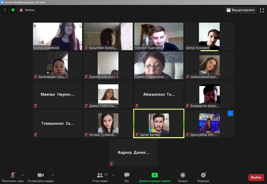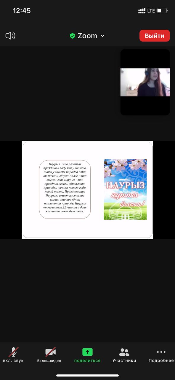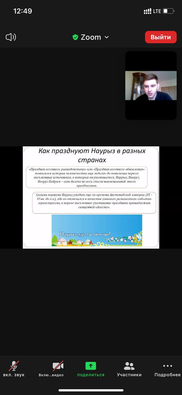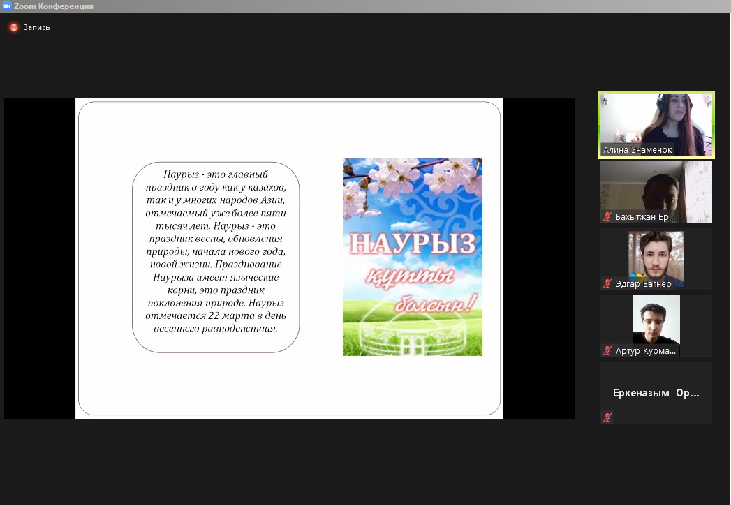 В рамках педагогической практики магистрантов 2020-2021 года, студенты группы МН-11 НП в лице студентов А. Знаменок и К. Зудочкиным провели кураторский час в честь прошедшего национального праздника «Наурыз» под руководством научного руководителя к.э.н профессора Легостаевой А.А.