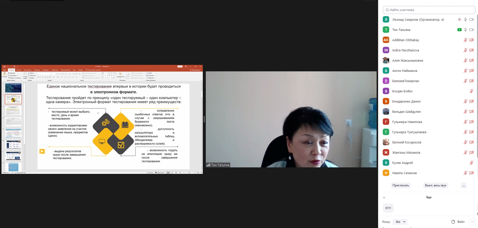 На онлайн встрече были рассмотрены основные аспекты сдачи экзаменов при поступлении на бюджет, а также на платной основе. Освещены следующие интересующие студентов вопросы: предоставляет ли университет скидки на обучение? Если возможность перевестись с платного на бесплатное обучение? Предоставляет ли университет иногородним общежитие?