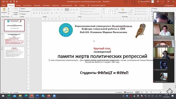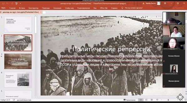 21апреля 2021 года в Карагандинском университете Казпотребсоюза прошла он-лайн конференция «Памяти жертв политических репрессий» в рамках реализации Программы «Рухани жаңғыру», организованная кафедрой СР и АНК, в которой активное участие приняли студенты 2 курса. Были обсуждены доклады, имеющие значимость в модернизации общественного сознания и исторического мышления студенческой молодежи: «Философы, подвергшиеся репрессиям», Сарина Малика ПИМ 19-1, «Деятели Алаш-Орды» Ислам Рахимгулов, ПИМ 19-1, «Сталинский мобилизационный проект индустриализации и насильственное переселение» Ильин Павел, ИС 19-2, «Статья Иосифа Сталина «Головокружение от успехов»» Бахтияров Аслан. ПИМ 19-1, «Спецпереселенцы в Карагандинской области Баскакова» Арина Лог 19-2, «Депортация народов в Казахстан» Фатхуллина Рузанна Лог 19-2, «Карагандинские спецпереселенцы» Ришкус Вячеслав. ИС -19-2, «История лагеря «АЛЖИР»», Жансакалова Анеля ПИМ 19-1, «История КарЛАГа» Серик Аида Пим 19-1.