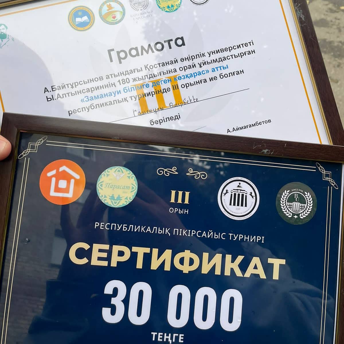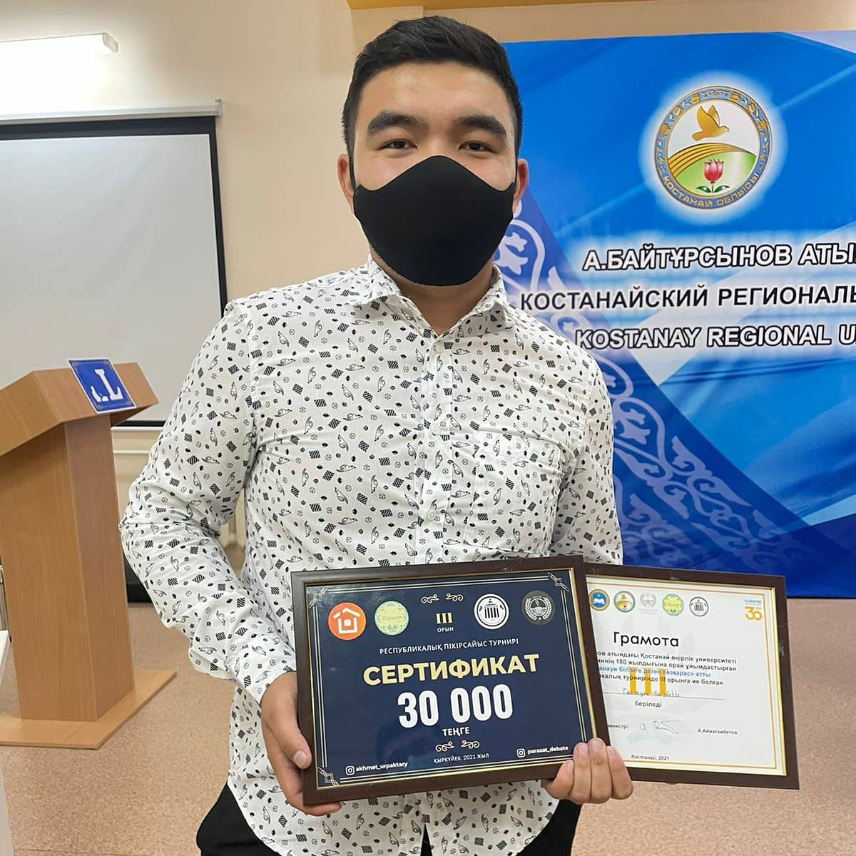 Поздравляем Камен Омирбека магистранта гр.Ю-21-1к маг(П) с занятым 3 местом в республиканском дебатном турнире "Заманауи білімге деген көзқарас", посвященного 180-летию Ы. Алтынсарина, который проходил на базе Костанайского регионального университета им. А. Байтурсынова.