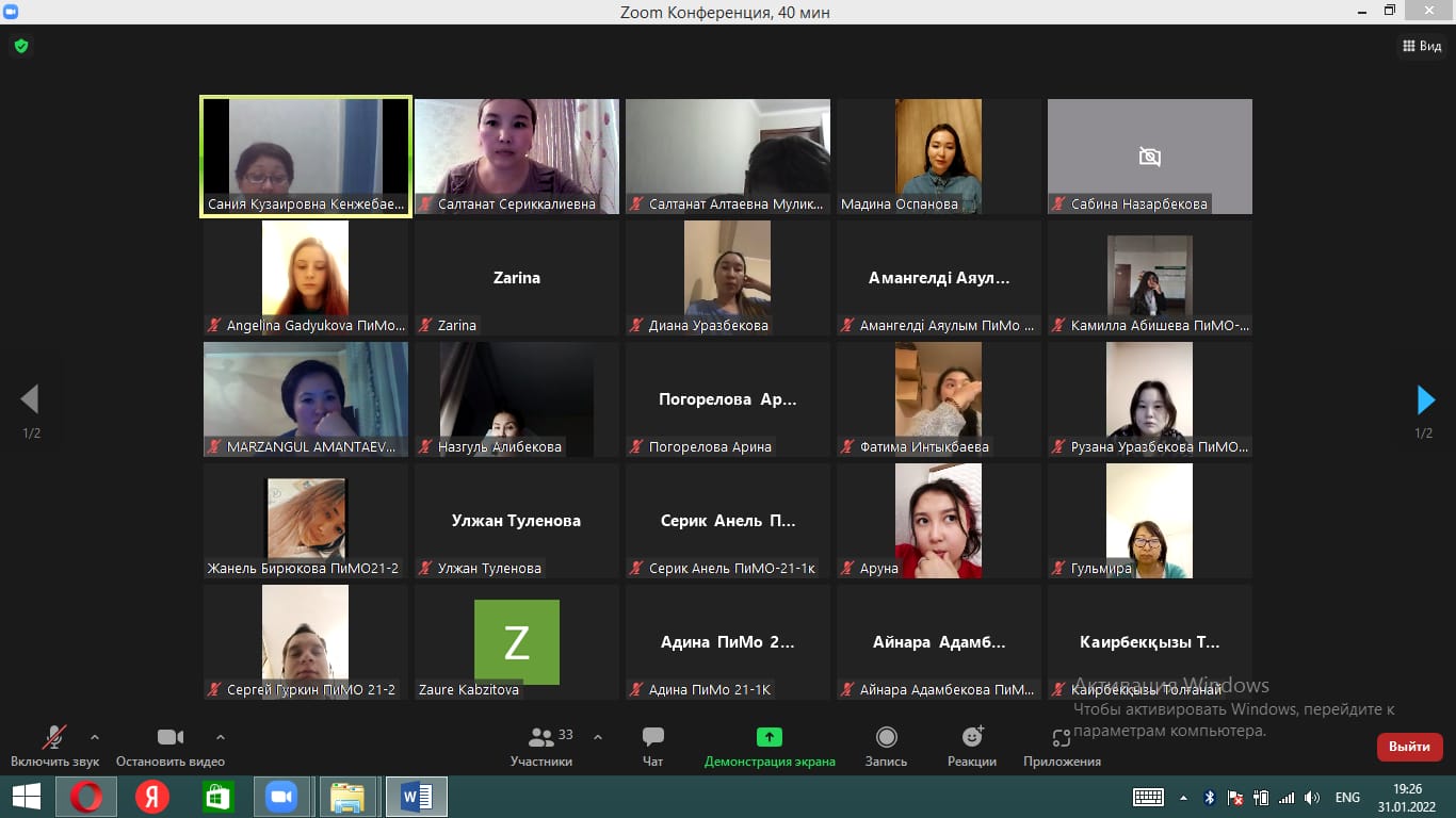 31 января 2022 года кафедрой «Психология, педагогика и социальная работа» организована в формате онлайн платиновая лекция психолога «Центра психотерапии Евгении Ивановой» г.Караганды Оспановой Мадиной Булатовной на тему «Психология жертвы».