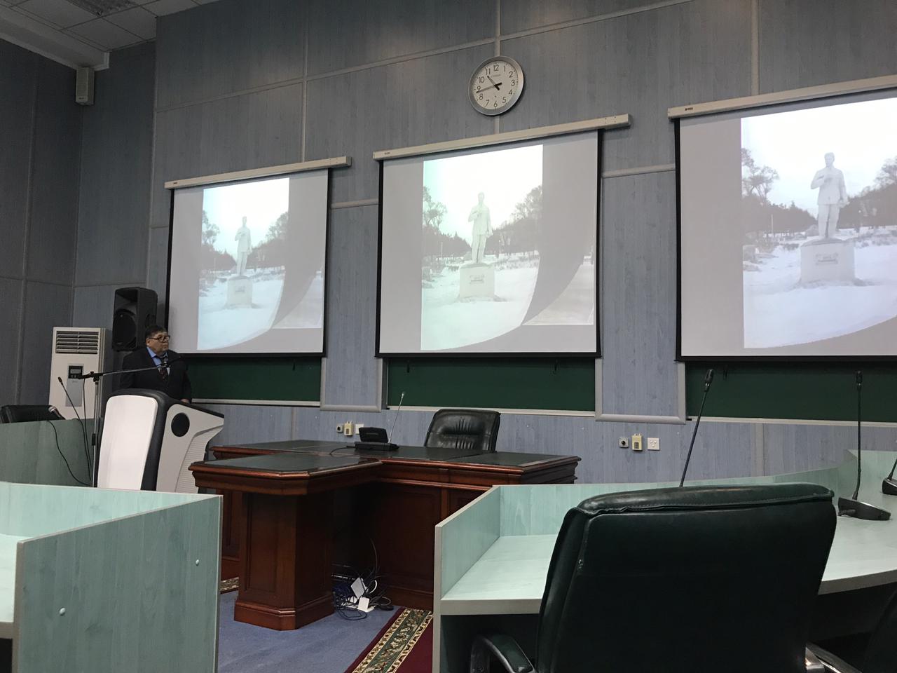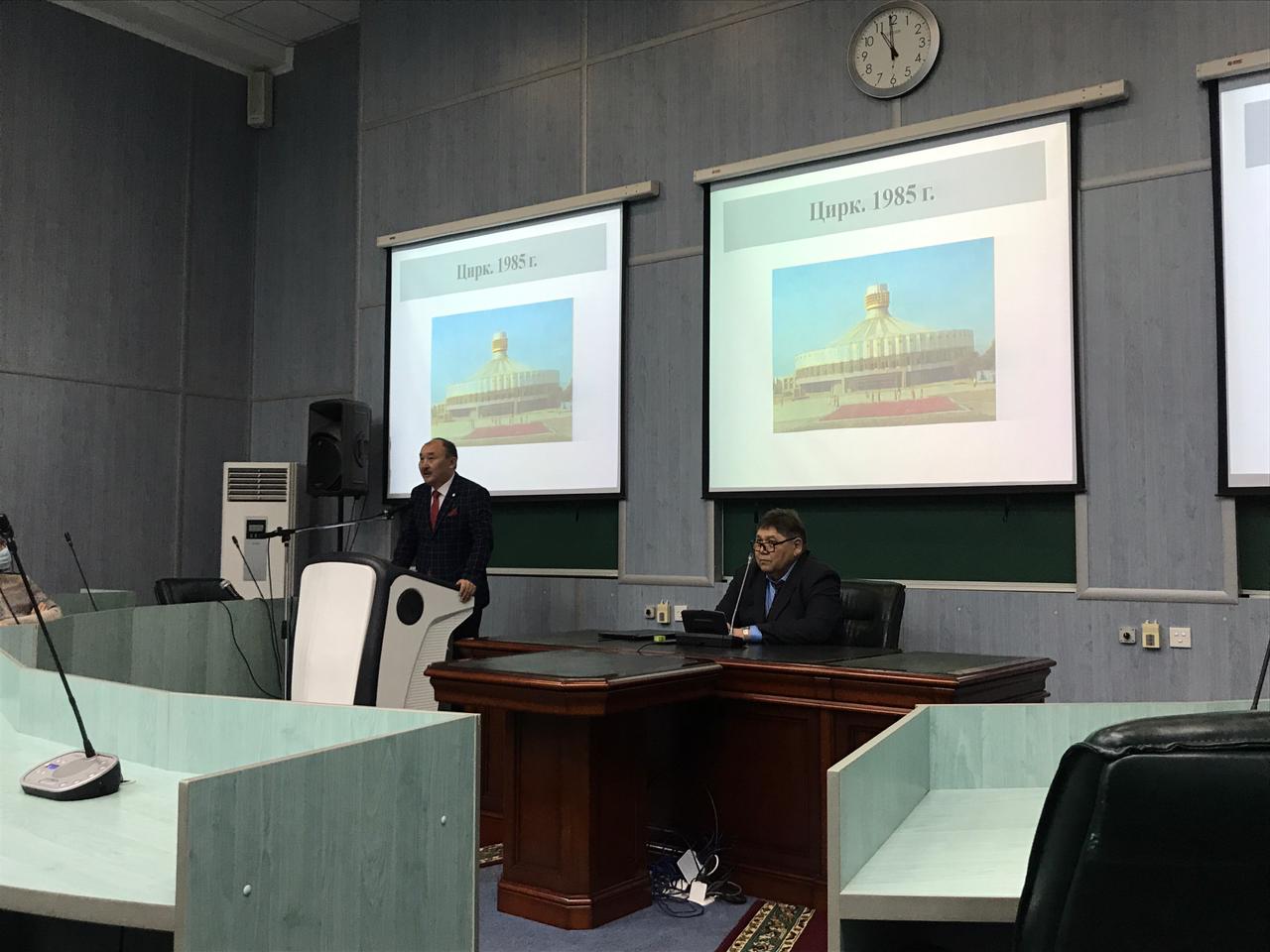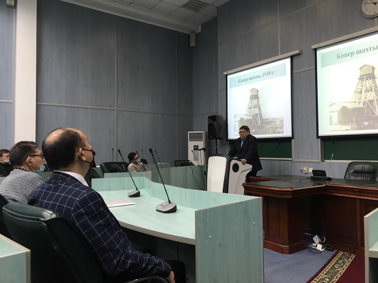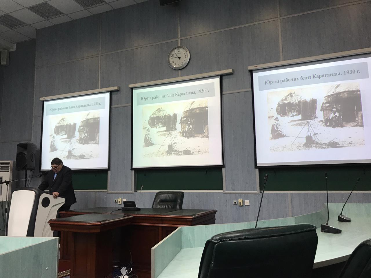 Модератор круглого стола, проректор по социальным вопросам Абилов К.Ж. рассказал краткую историю возникновения и становления города Караганды, осветил вклад карагандинцев в победу над фашистской Германией, затронул вопросы развития города в советский период и в условиях независимости.