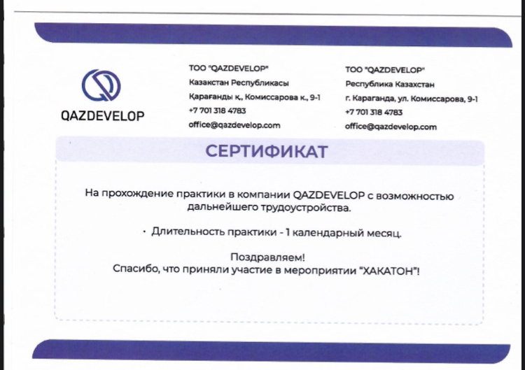 По результатам хакатона команда нашего университета в составе студентов группы гр. ИС-20-2 Әмірқұл Н.А., Балмакаева Т.М., а также магистранта группы Ф-21-1 НП Жанбекова А. заняли 2 место.