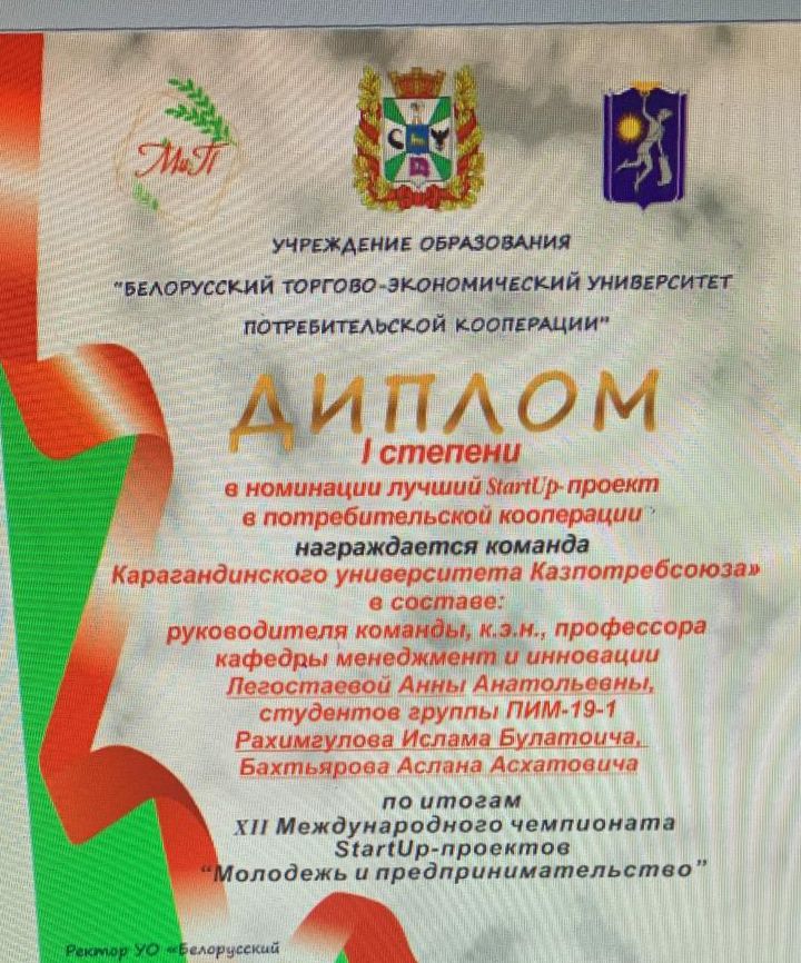 По итогам чемпионата StartUp-проект студентов 2-го курса образовательной программы «Проектно-инновационный менеджмент» Рахимгулова Ислама Булатовича, Бахтьярова Аслана Асхатовича под научным руководством к.э.н., профессора кафедры «Менеджмент и инновации» Легостаевой Анны Анатольевной были награждены дипломом 1 степени.