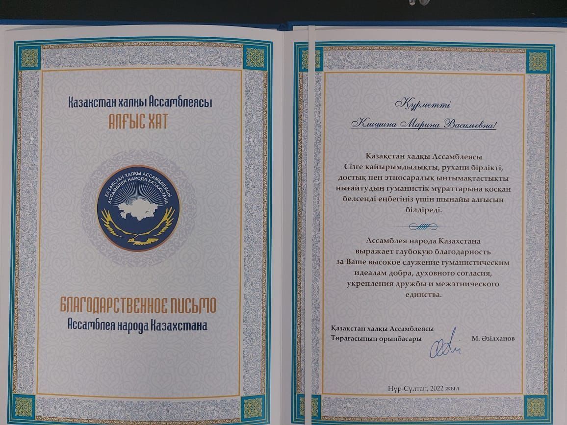 Ассамблея народа Казахстана выражает глубокую благодарность к.ф.н., профессору кафедры «Социально-политических дисциплин и Ассамблеи народа Казахстана» Карагандинского университета Казпотребсоюза Клишиной Марине Васильевне, за высокое служение гуманистическим идеалам добра, духовного согласия, укрепления дружбы и межэтнического единства.