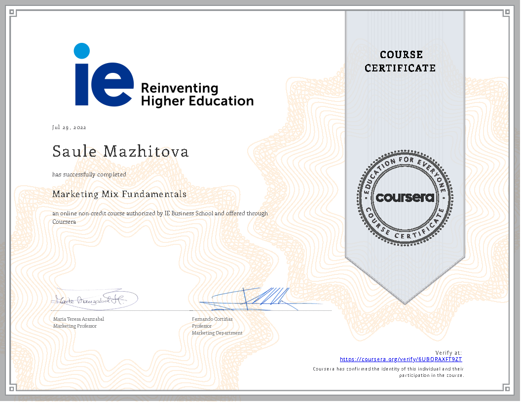 Так, заведующая кафедрой, к.э.н., доцент Мажитова Сауле Калиевна прошла онлайн курс Marketing Mix Fundamentals (Основы маркетинг-микс) от международной школы бизнеса IE Business School на платформе Coursera и получила сертификат об успешном завершении указанного курса.