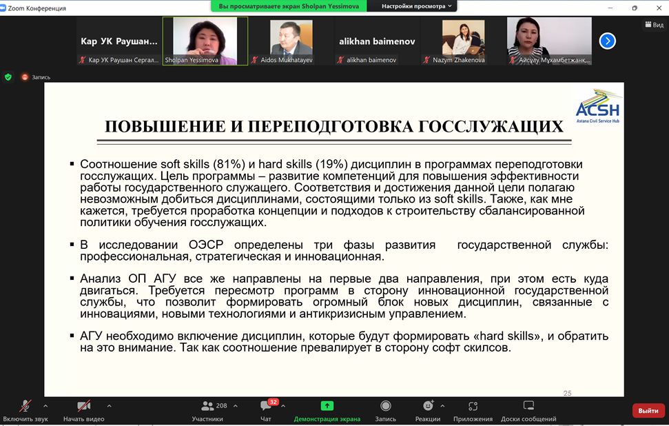 С докладами выступили эксперт в области высшего образования и государственного управления, доктор экономических наук, доцент Есимова Шолпан и эксперт в области менеджмента образования Каратабанов Руслан. Были обсуждены следующие вопросы: