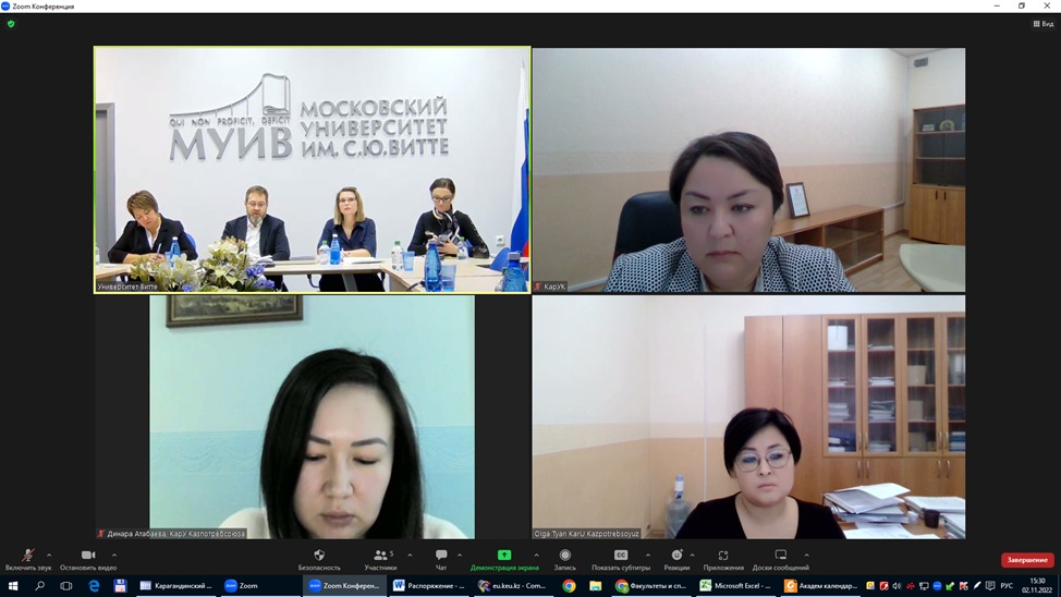 Встреча прошла 03 ноября 2022 года в онлайн формате по инициативе наших давних партнёров из Москвы. Проректор по развитию университета им. Витте Ермолаев В.В. и проректор по академическим вопросам и стратегическому развитию КарУК Абеуова С.Т. наметили конкретные пути международного сотрудничества, взаимодействия в плане академической мобильности студентов, внедрения совместных образовательных программ и т.д. Во встрече приняли участие также представители Центров международных программ и проектов двух университетов, Департаментов академического развития ВПО.