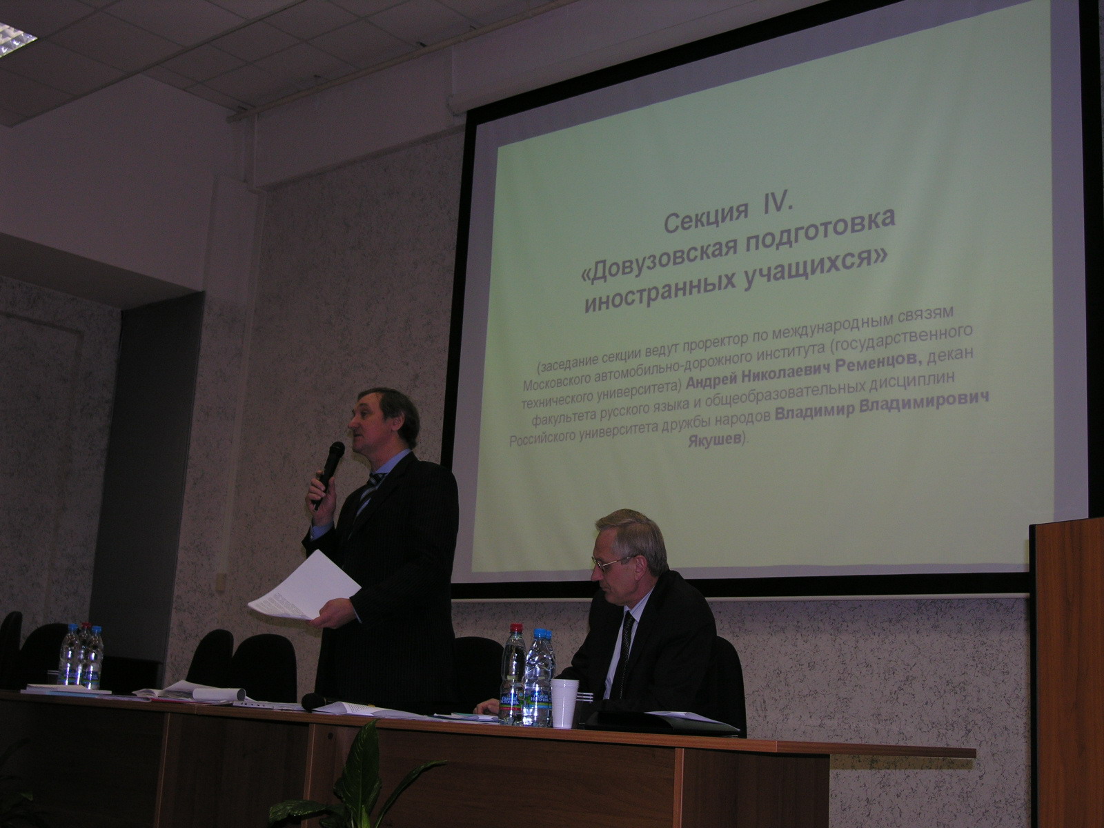 Секция IV. «Довузовская подготовка иностранных учащихся» (заседание секции ведут проректор по международным связям Московского автомобильно-дорожного института (государственного технического университета) Андрей Николаевич Ременцов, декан факультета русского языка и общеобразовательных дисциплин Российского университета дружбы народов Владимир Владимирович Якушев ).