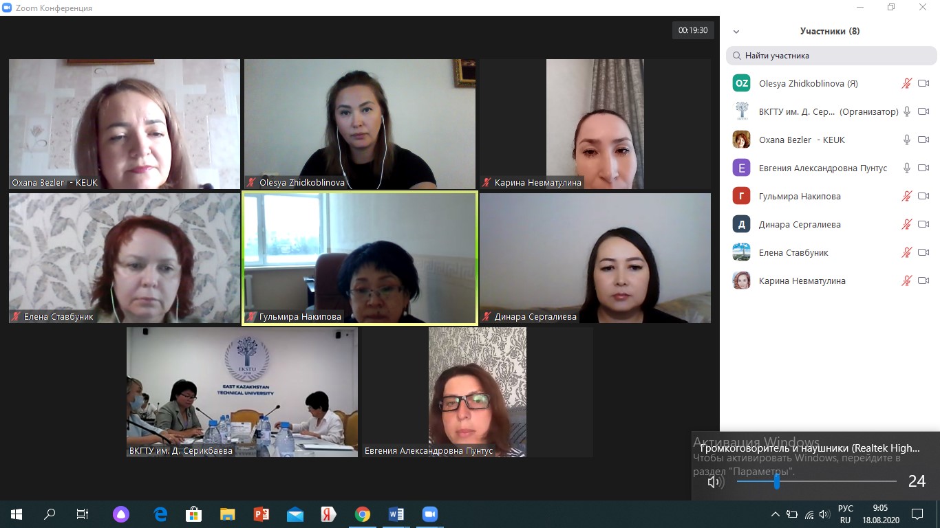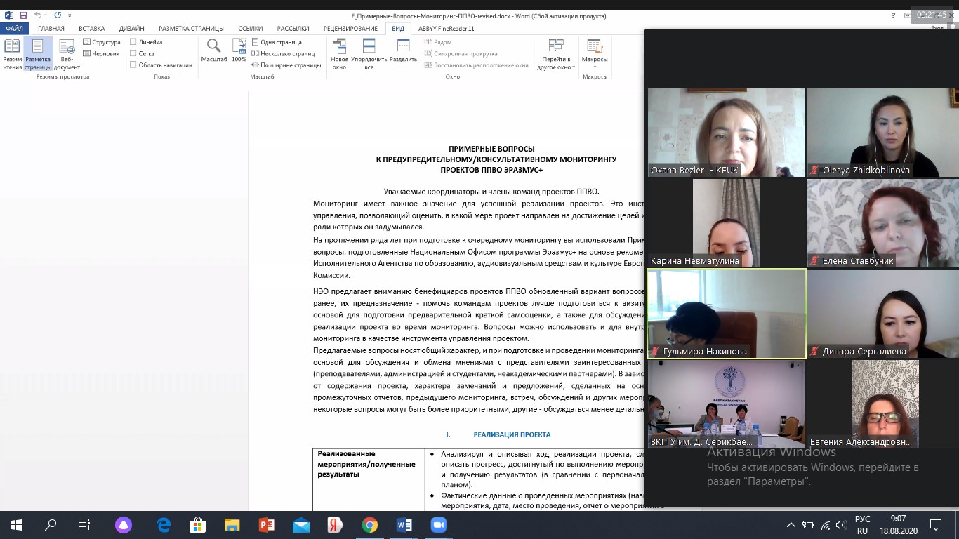 18 августа 2020 года на базе Восточно-Казахстанского технического университета имени Д. Серикбаева состоялся первый (превентивный) мониторинг результатов проекта 610198-EPP-1-2019-1-ES-EPPKA2-CBHE-JP MIETC «Разработка магистерской программы по управлению предпринимательской деятельностью промышленных предприятий для стран с переходной экономикой» под руководством директора Национального Офиса Эразмус+ в Казахстане Тасболатовой Ш.У. Команда проекта Карагандинского экономического университета во главе с проректором по научной работе, стратегическому и инновационному развитию д.э.н., профессором Накиповой Г.Е. приняла участие в мониторинге в онлайн формате. В ходе мониторинга участники рабочей группы проекта MIETC от ВКТУ им. Д. Серикбаева и участники рабочей группы проекта MIETC от КЭУК (в онлайн формате) ознакомились с целями и задачами мониторинга, презентовали результаты проекта и обсудили ход реализации проекта.