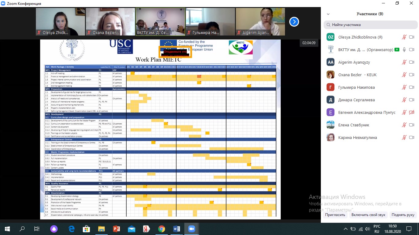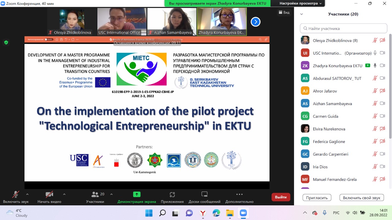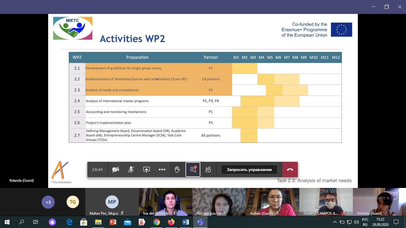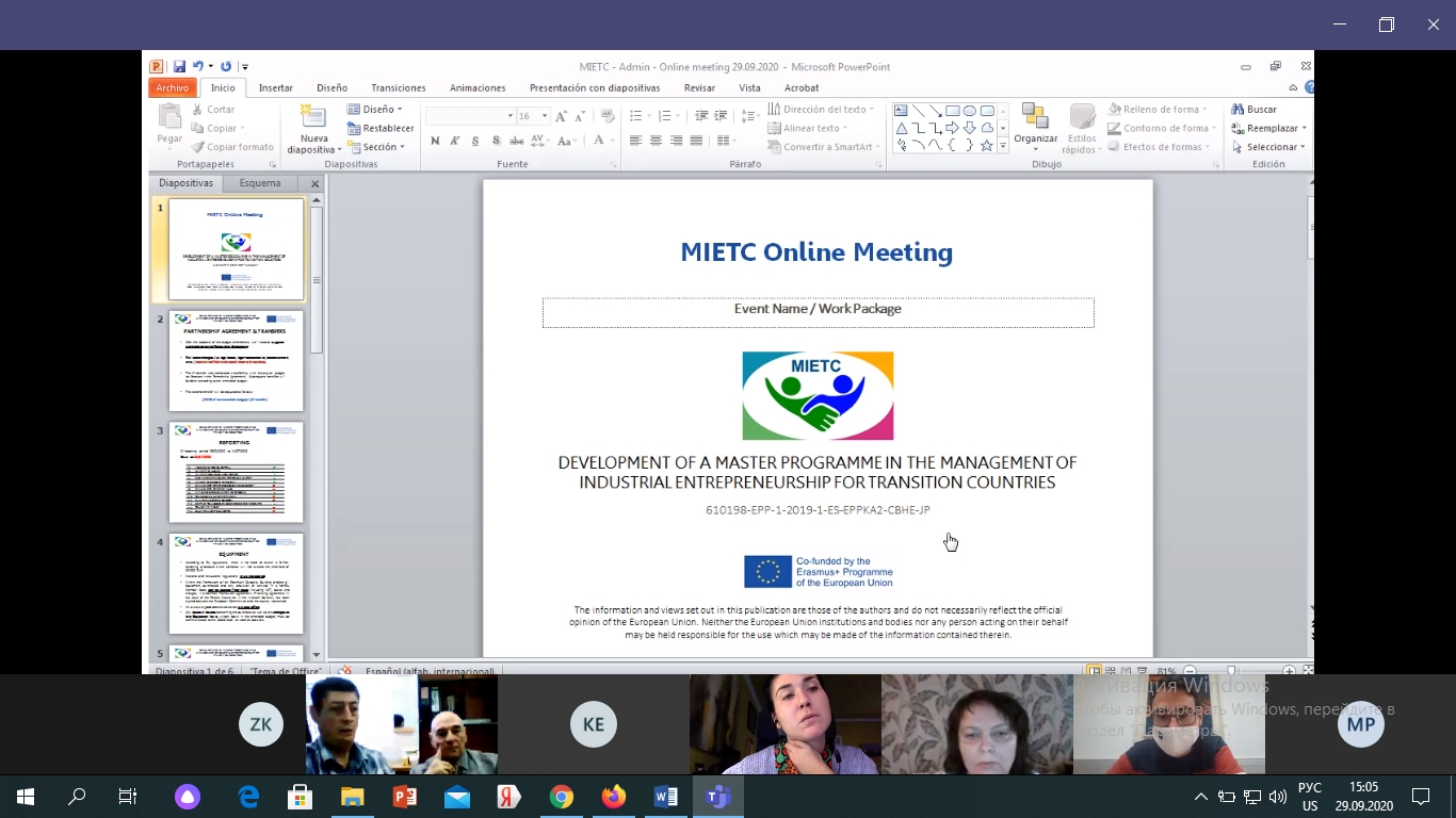 29 сентября 2020 года согласно рабочему плану реализации проекта состоялась очередная онлайн-встреча стран-участников проекта Erasmus+ 610198-EPP-1-2019-1-ES-EPPKA2CBHE-JP «Разработка магистерской программы по управлению промышленным предпринимательством для стран с переходной экономикой (MIETC)».