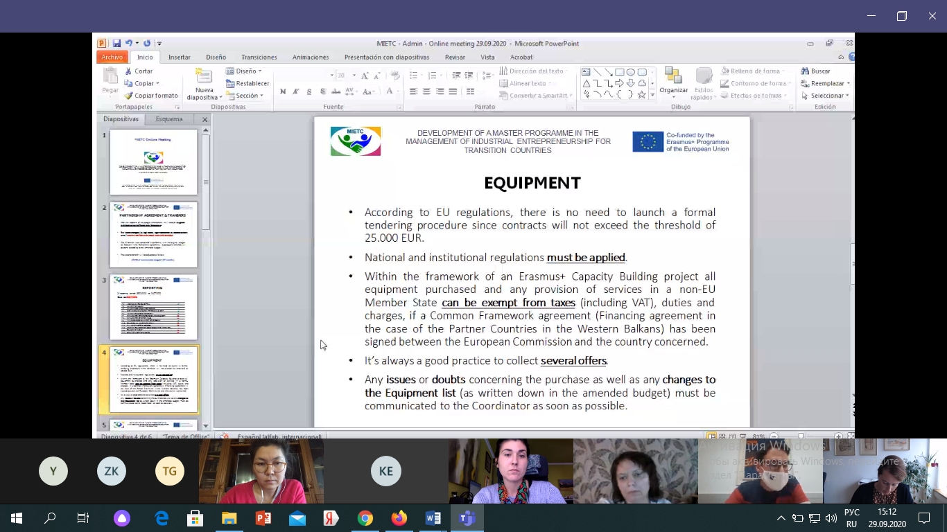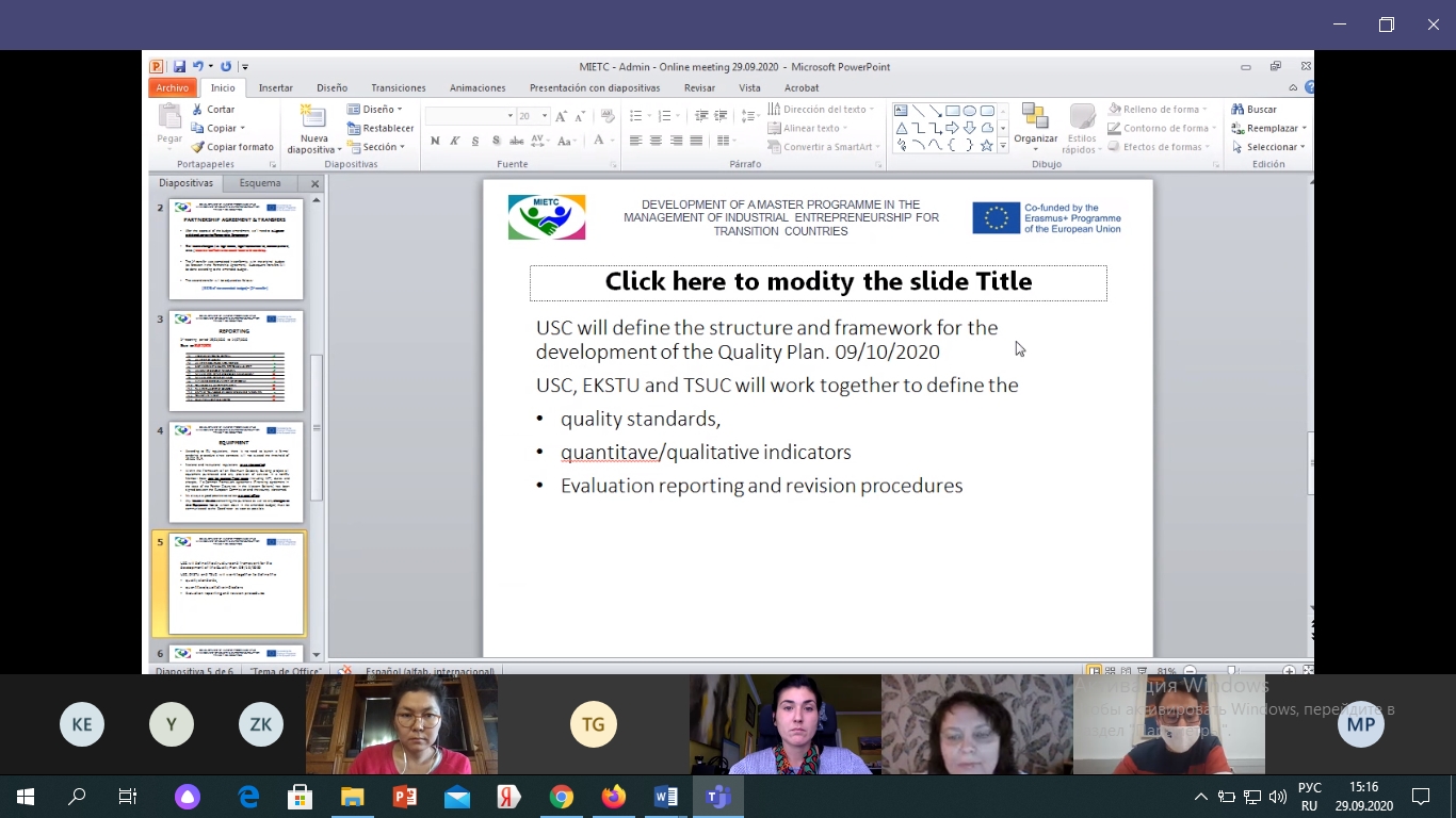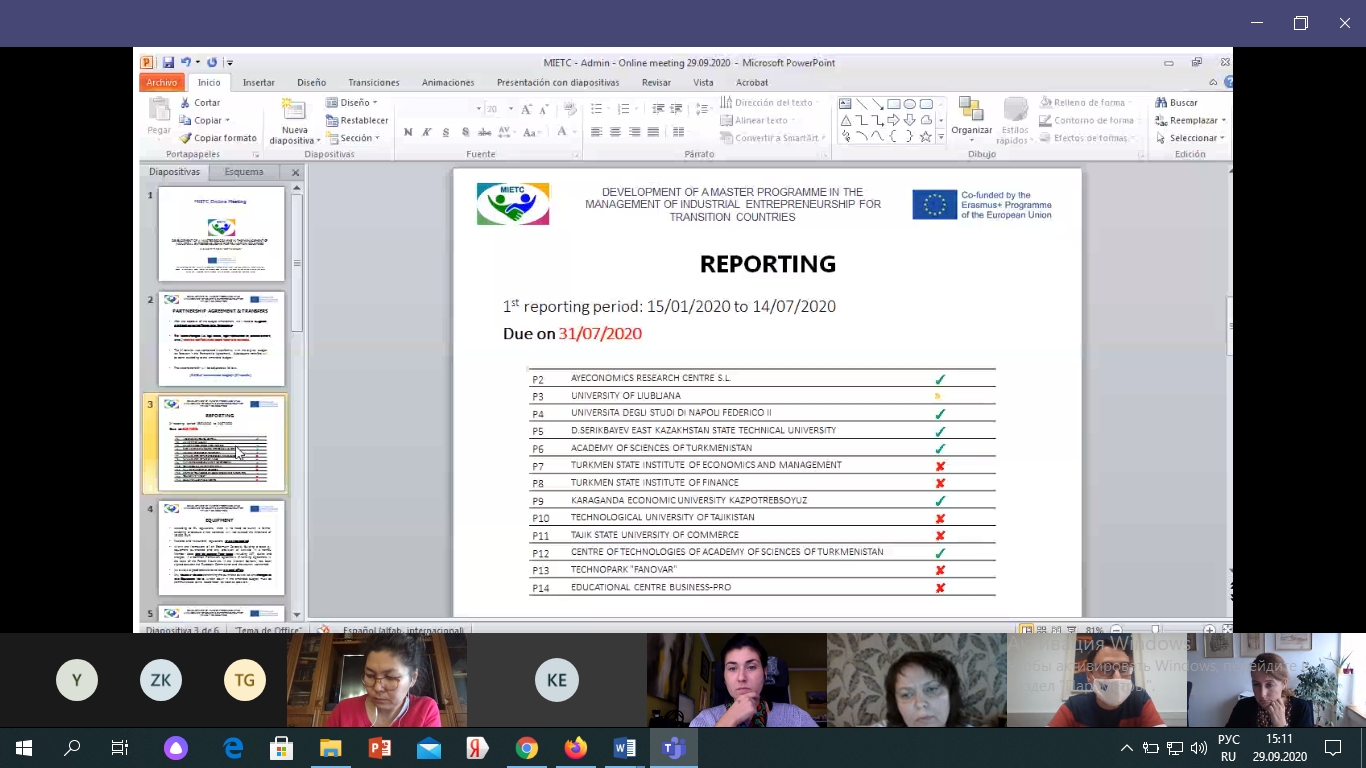 29 сентября 2020 года согласно рабочему плану реализации проекта состоялась очередная онлайн-встреча стран-участников проекта Erasmus+ 610198-EPP-1-2019-1-ES-EPPKA2CBHE-JP «Разработка магистерской программы по управлению промышленным предпринимательством для стран с переходной экономикой (MIETC)».