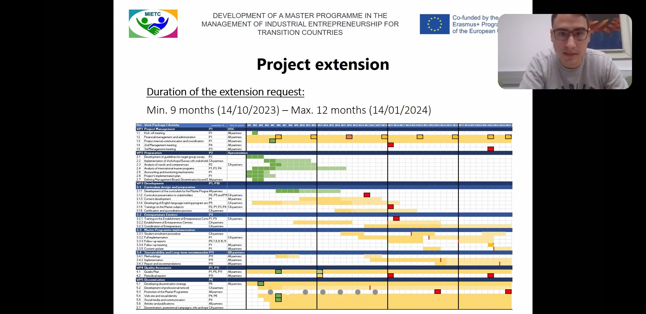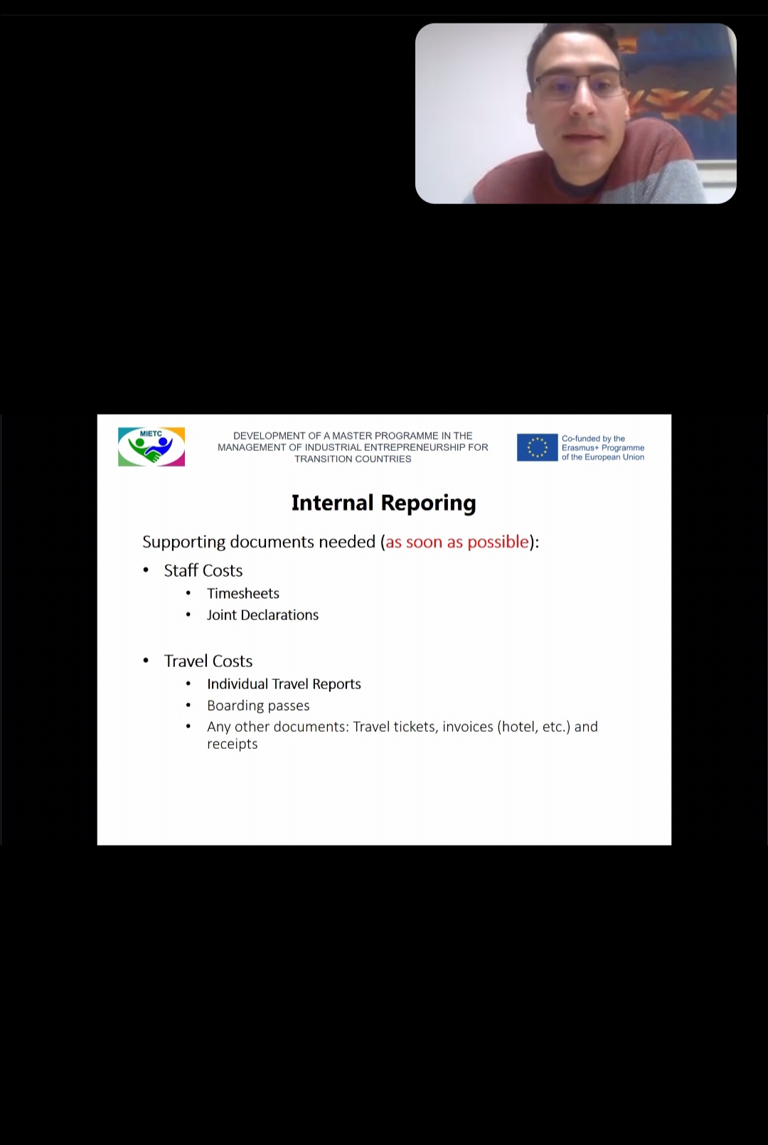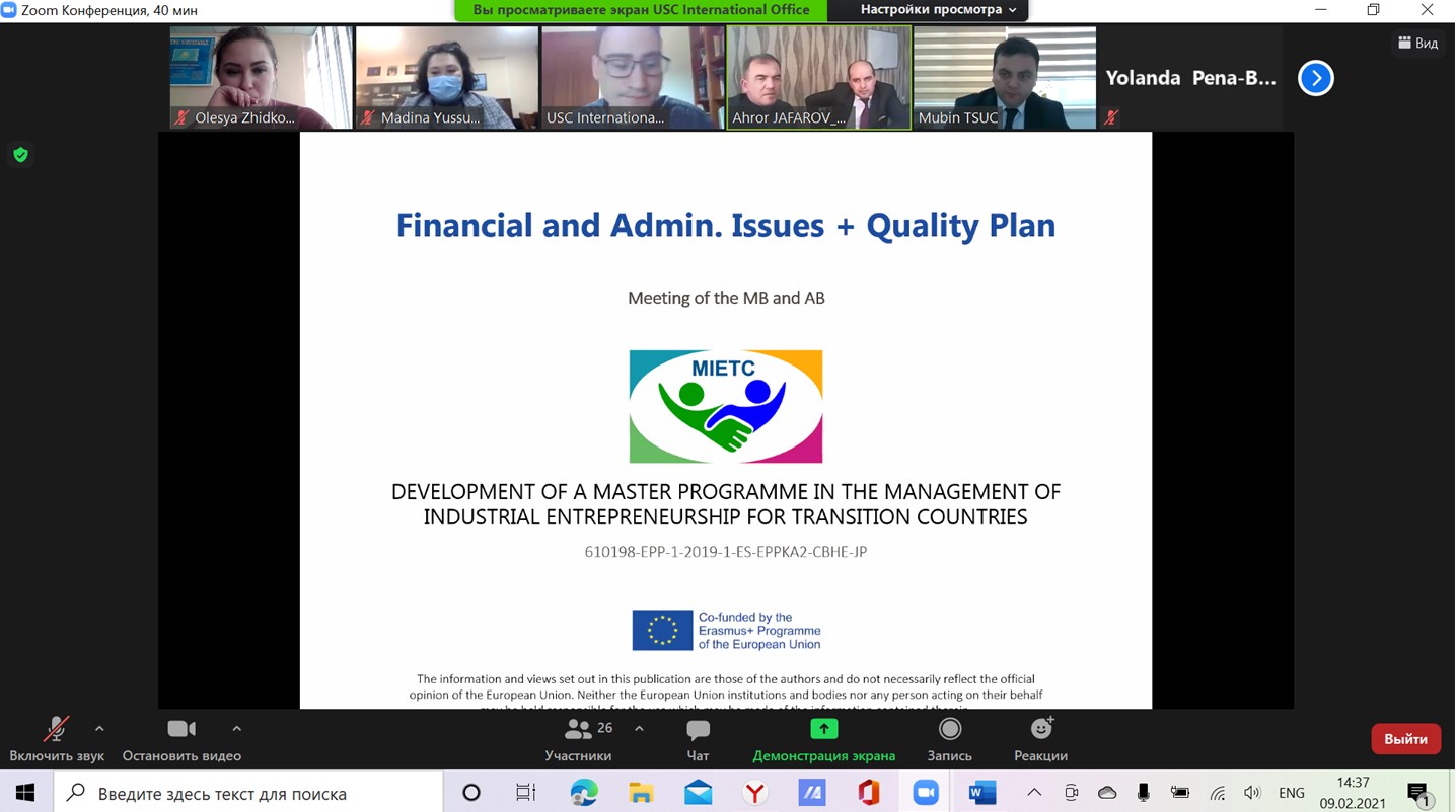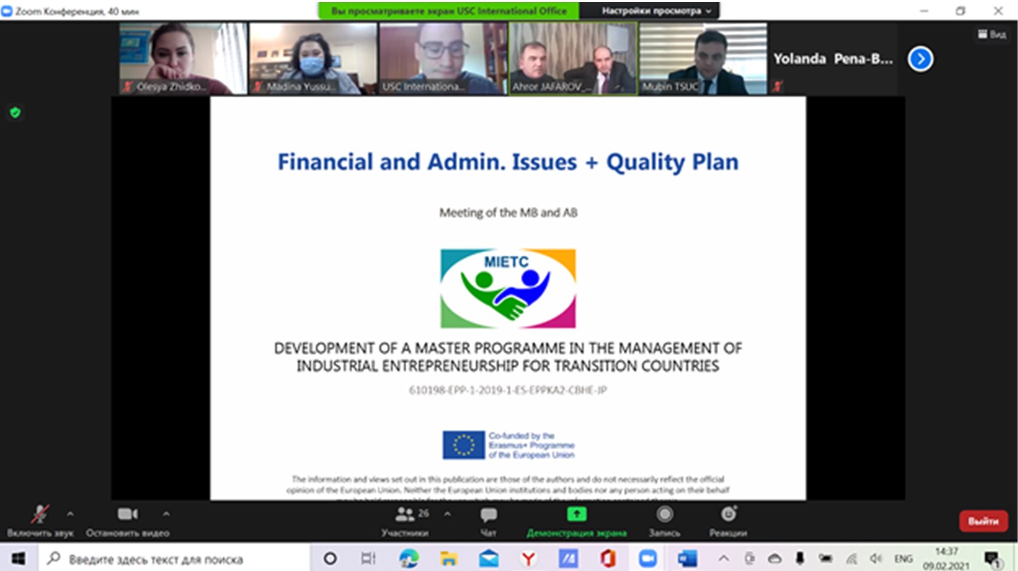 21 апреля 2021 года состоялась очередная онлайн встреча участников проекта в рамках программы Erasmus+ «Разработка магистерской программы по управлению промышленным предпринимательством для стран с переходной экономикой (MIETC)». В рамках встречи была рассмотрена и согласована возможность продления срока реализации договора на 1 год в связи со сложной эпидемиологический ситуацией и невозможностью организацией очных встреч для обсуждения хода проекта. Координатор проекта Университет Сантьяго-де-Компостела представила обновленный рабочий план, и возможные сценарии отчетности.