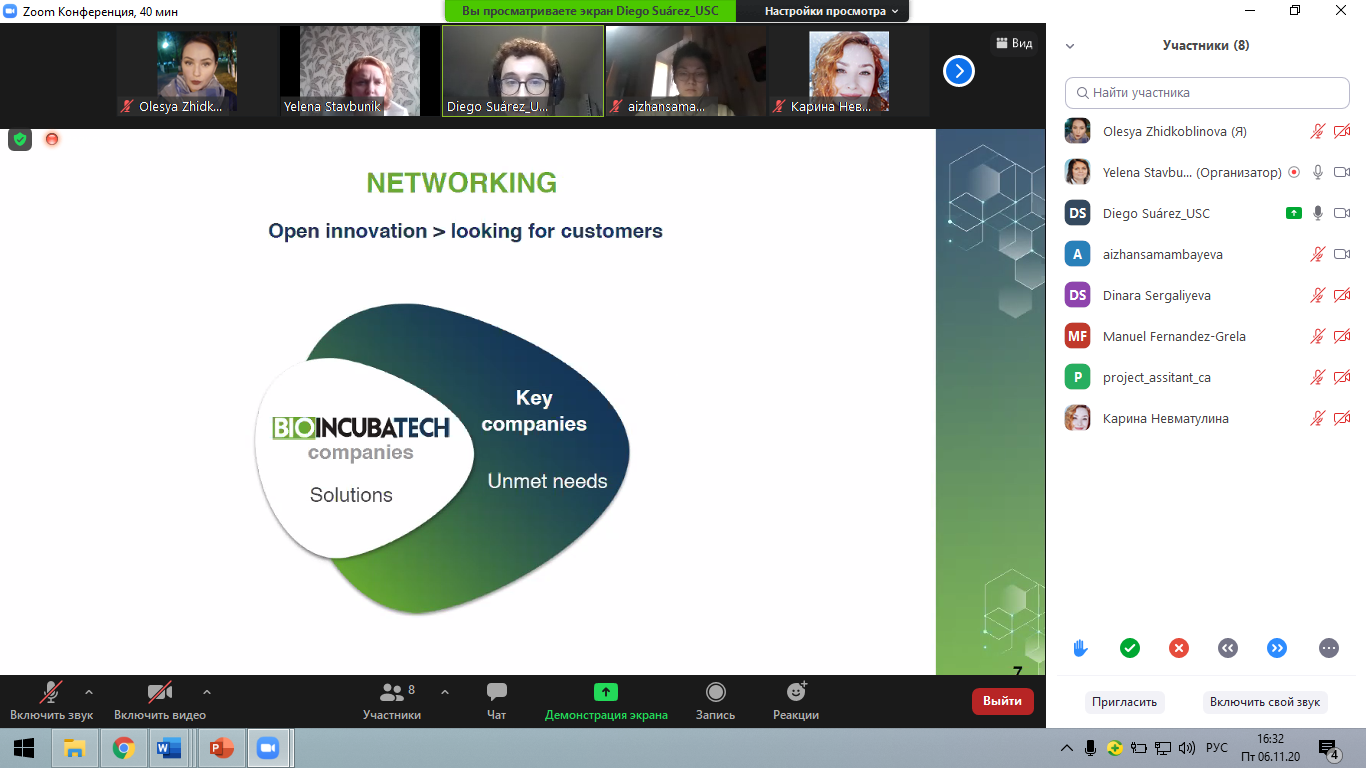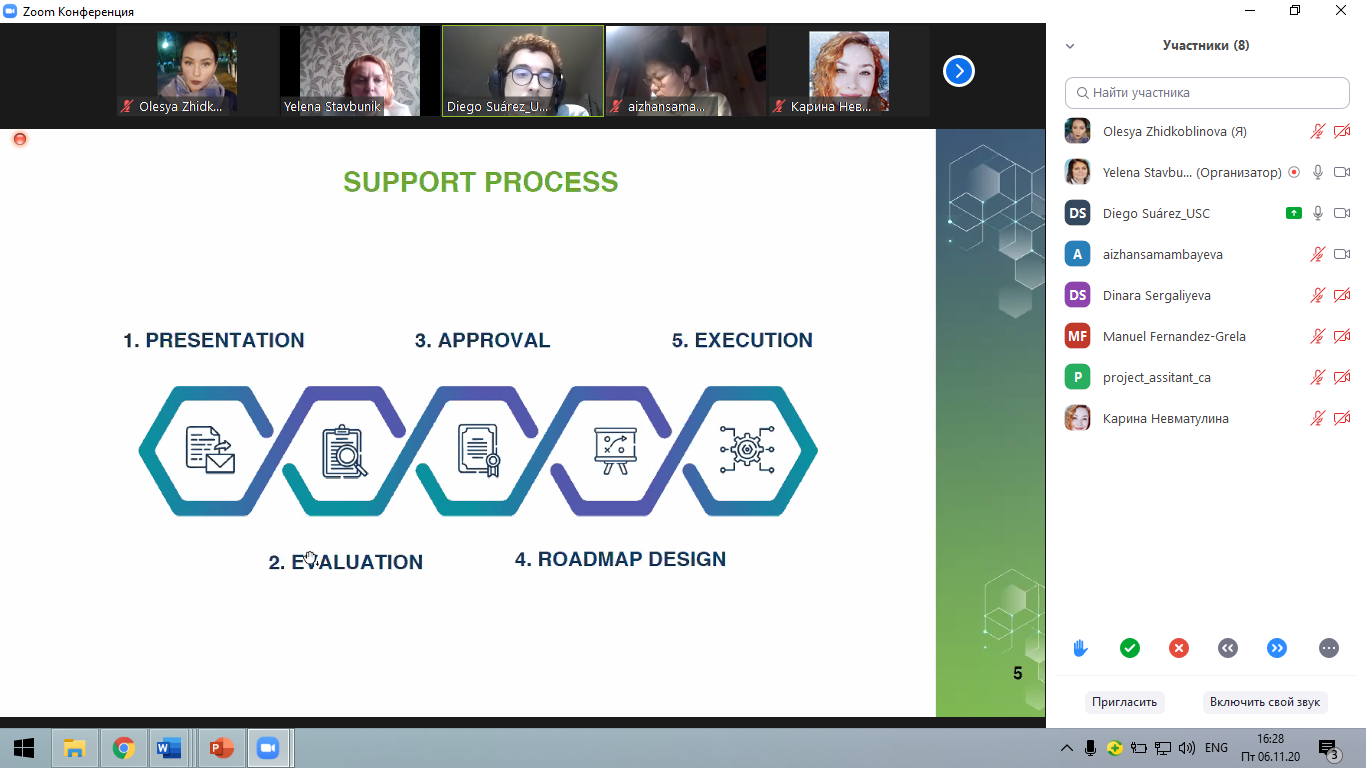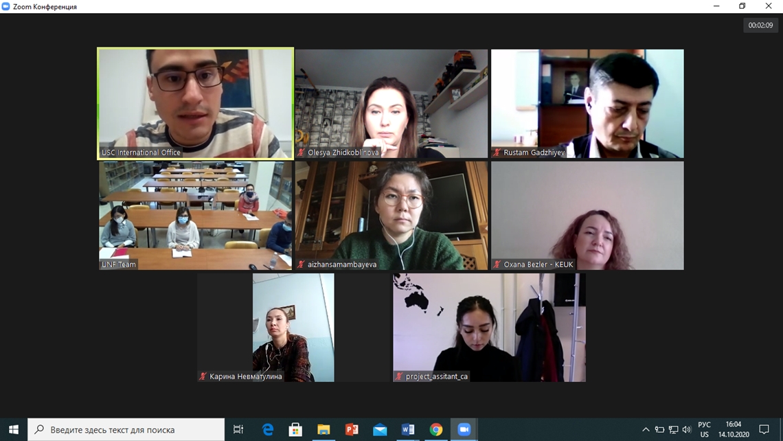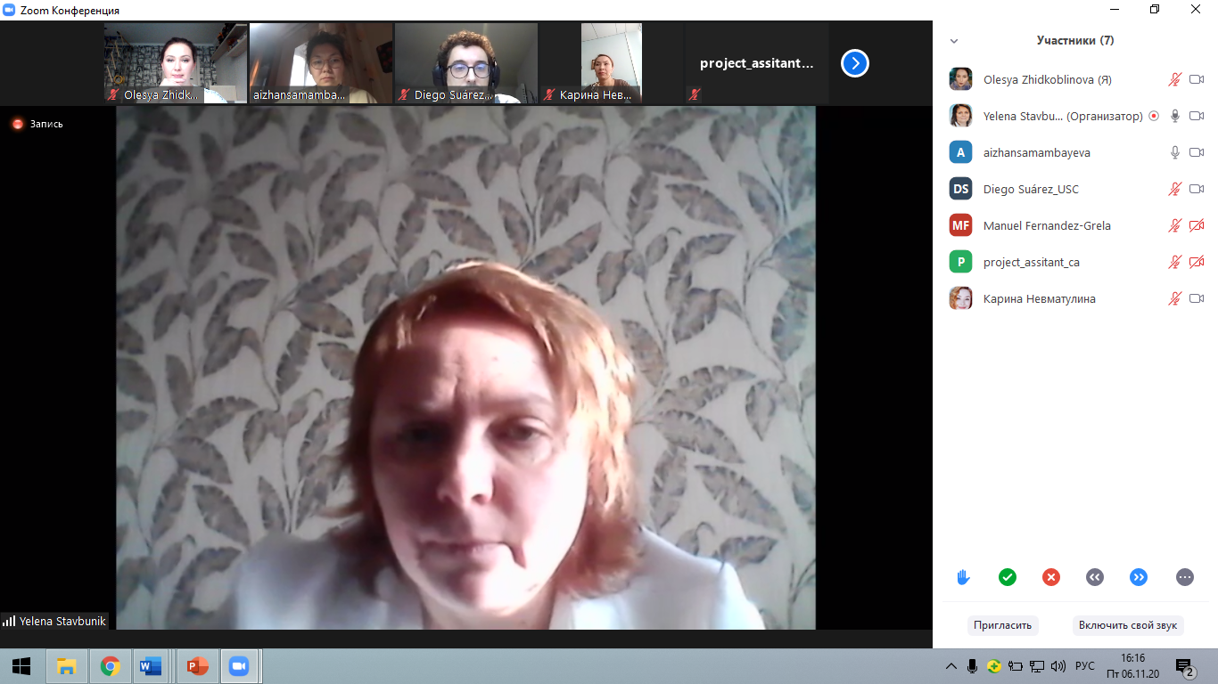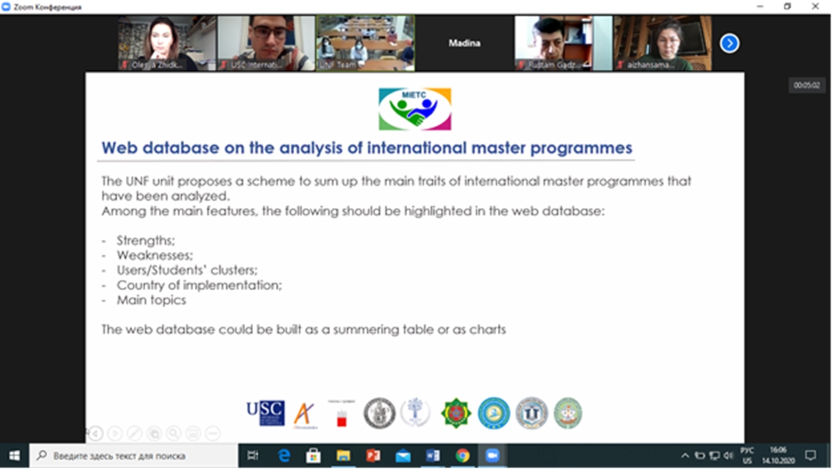 В рамках онлайн встречи участники обсудили вопросы, касающиеся реализации финансовых аспектов партнерских соглашений, вопросы приобретения оборудования, а также необходимости разработки плана качества. Представитель Восточно-Казахстанского государственного технического университета Юсубалиева Мадина выступила с отчетом по результатам курса повышения уровня владения английским языком на платформе Coursera преподавателями, участвующими в дальнейшей реализации магистерской программы MIETC. Профессор Университета Сантьяго-де-Компостела Мануэль Фернандес Грела в своем выступлении затронул вопросы структуры магистерской программы. По результатам встречи всеми участниками проекта были определены дальнейшие шаги и даны рекомендации по каждому из направлений реализации проекта.