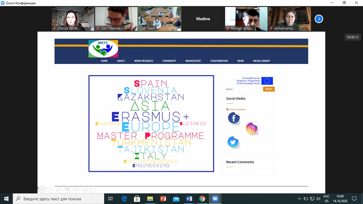 14 октября 2020 года состоялась короткая онлайн встреча участников проекта Erasmus+ 610198-EPP-1-2019-1-ES-EPPKA2CBHE-JP «Разработка магистерской программы по управлению промышленным предпринимательством для стран с переходной экономикой (MIETC)» с целью обсуждения рабочих моментов по диссеминации проекта в частности на веб-сайтах и социальных сетях.