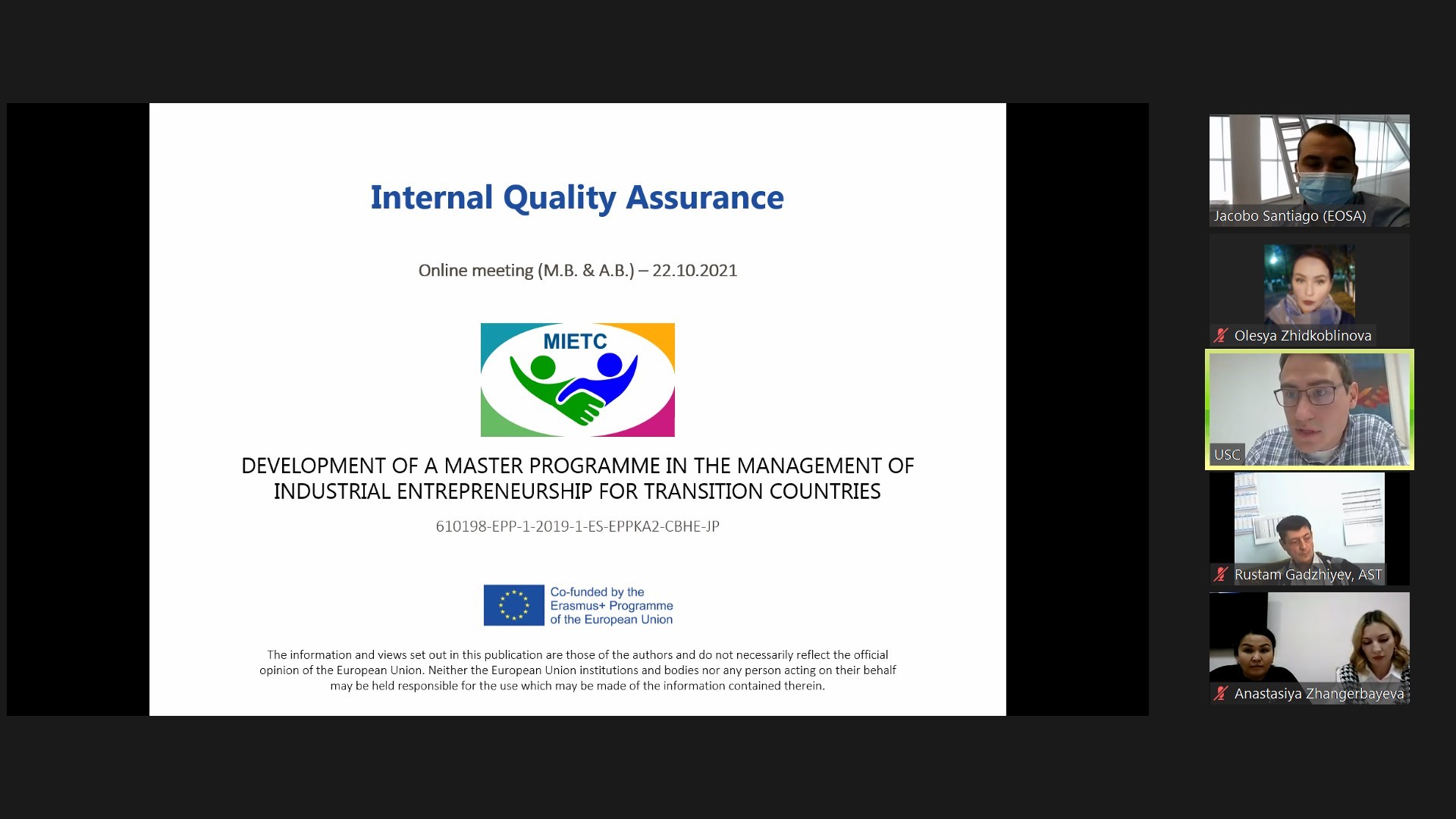 24 сентября 2021 года состоялась очередная онлайн встреча Консорциума участников проекта «Разработка магистерской программы по управлению промышленным предпринимательством для стран с переходной экономикой (MIETC)». В рамках встречи были обсуждены следующие вопросы: отчетные документы, в частности отчет о техническом внедрении, обновленный план работы в рамках расширения проекта, аккредитация магистерской программы, распространение и внешняя оценка, а также результаты мониторинга проекта в Казахстане и прочие рабочие вопросы.