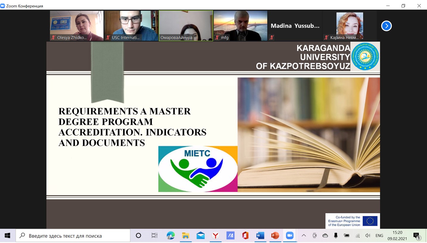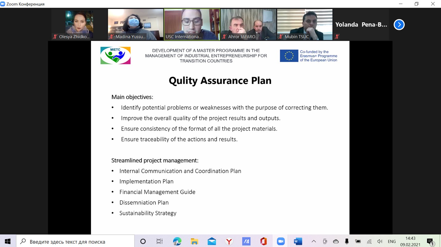 09 февраля 2021 года состоялась очередная онлайн встреча участников проекта в рамках программы Erasmus+ «Разработка магистерской программы по управлению промышленным предпринимательством для стран с переходной экономикой (MIETC)». В рамках встречи были рассмотрены финансовые и административные вопросы, был презентован план качества, предложены структура магистратуры и список дисциплин, а также рассмотрены процедуры аккредитации в Казахстане, Туркменистане и Таджикистане.