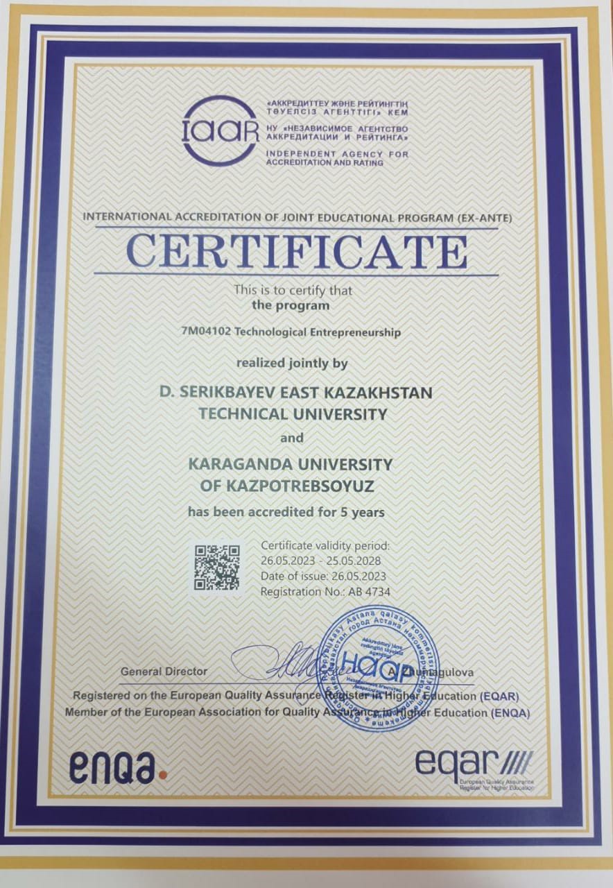 25 мая 2023 года НУ «Национальным Агентством аккредитации и рейтинга» (регистрационный номер №АВ4734) успешно аккредитована совместная образовательная программа магистратуры «Технологическое предпринимательство», разработанная и реализуемая двумя казахстанскими ВУЗами - Карагандинским университетом Казпотребсоюза и Восточно-Казахстанским техническим университетом имени Д. Серикбаева.